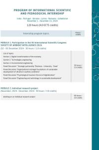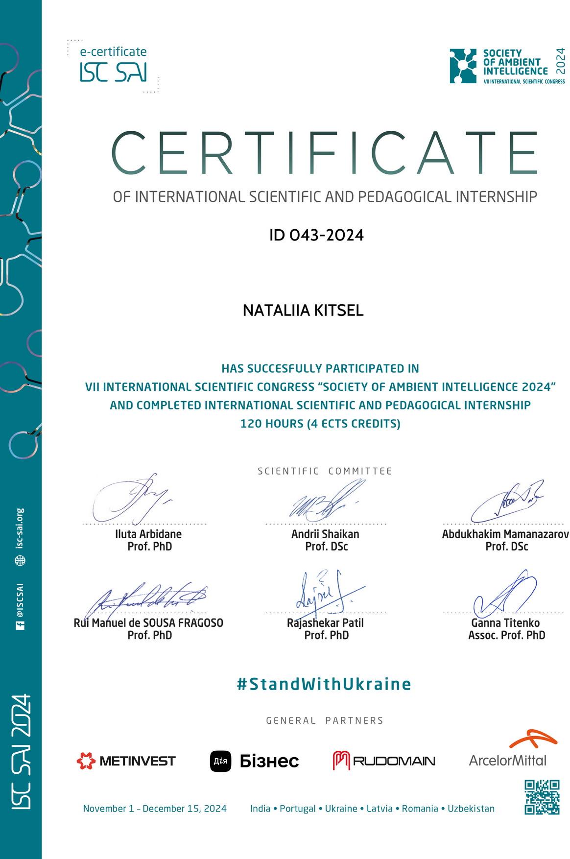 Research Associate of the Scientific Activity Organization Department Nataliia Kitsel took part in the VII International Scientific Congress ‘Ambient Intelligence Society 2024’, which was held on 2-6 December 2024 and successfully completed an international scientific and pedagogical internship. The purpose of the Congress was to organize a multifaced platform for cooperation of academic community and business in order to generate new knowledge and exchange information and best practices in the field of modern trends in the development of information society technologies in the context of the globalization of the digital economy. The Congress work was held in the format of panel discussions.