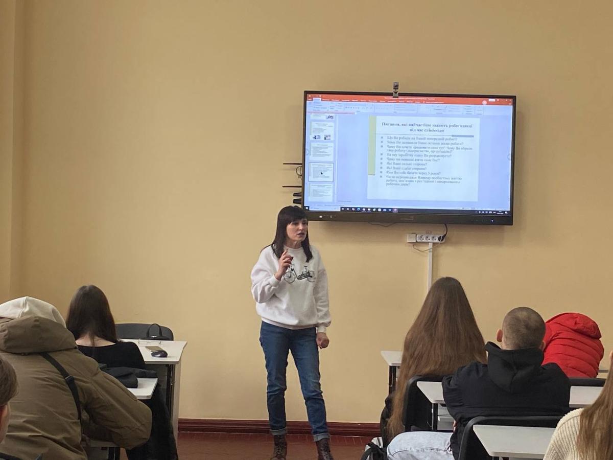 During this visit, Iryna Vasylivna Doroshenko, a psychologist at the Employment Department of the Kremenchuk Branch of the Poltava Regional Employment Centre, introduced the students to the opportunities provided by the employment service to support young people. She emphasized the importance of integrating graduates into modern labour market, developing their entrepreneurial skills and providing information and consulting assistance in job search. During the event, the students had the opportunity to receive comprehensive information on how to prepare for an interview with an employer, namely the stages of preparation for a meeting, preparation of questions and suggestions for the employer, as well as answers to possible questions from the employer. Together with the representative of the branch, the participants focused on the types of interviews and conditions of employment, discussed behaviour during a conversation with an employer, and practised answering the employer’s questions.