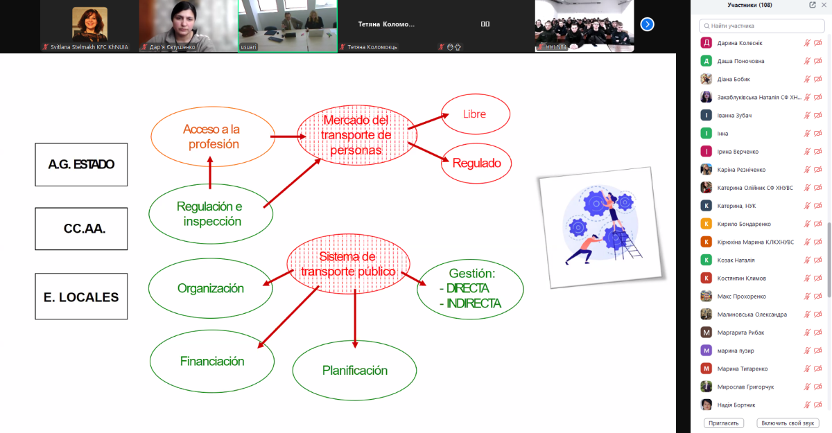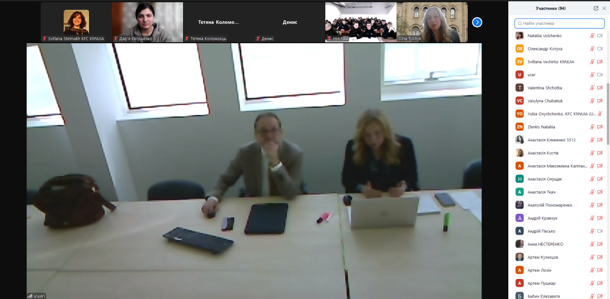Head of the Department of Management, Social Sciences, Humanities and Fundamental Disciplines Maryna Kiriukhina, teachers of the Department Vira Siora, Olha Khomiak, Inna Ryshkova, Maryna Puzyr, specialist of the International Relations and Interuniversity Work Group Svitlana Stelmakh, Yuliia Onyshchenko, translator of the International Relations and Interuniversity Work Group, as well as students majoring in ‘Air Transport’ joined the first webinar in a series of events organised by the Institut de Recerca TransJus Universidad de Barcelona.