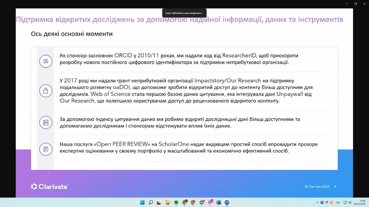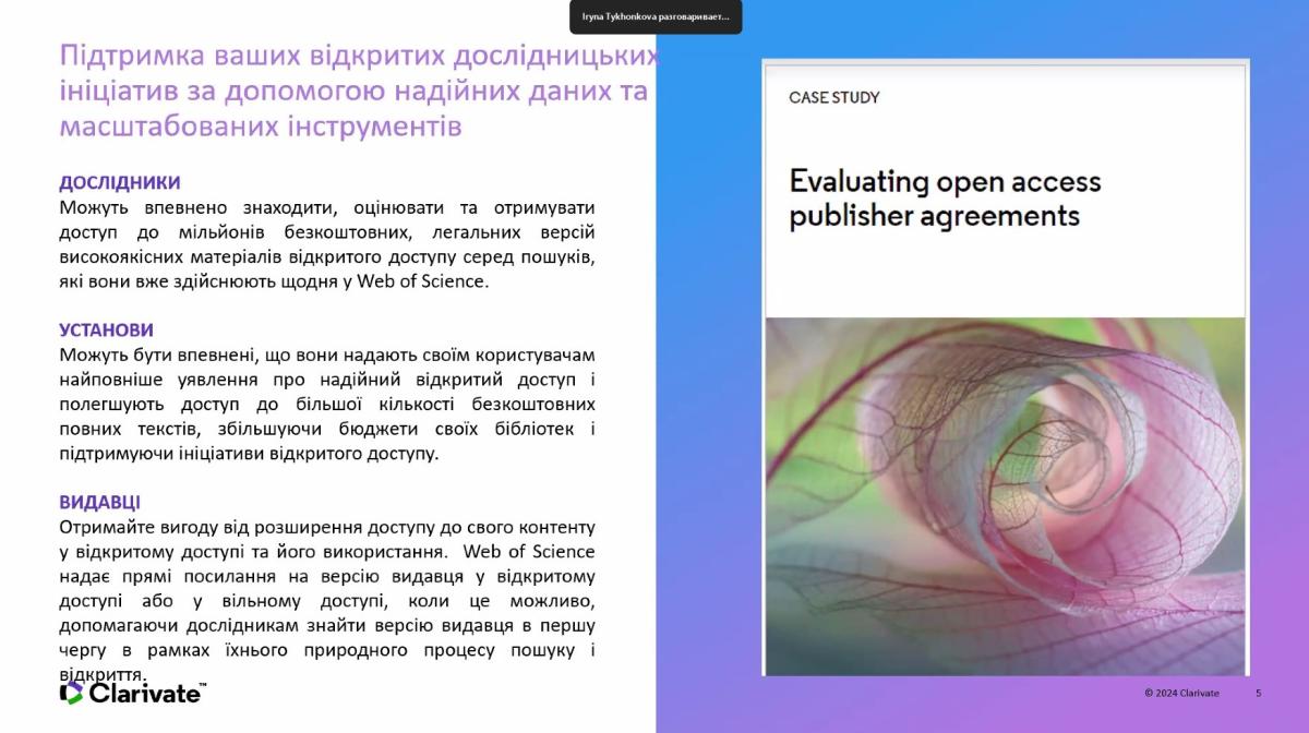During the webinar, participants had the opportunity to learn about the concept of open access and its importance in modern science; learn about the benefits of open scientific data and its use in research; consider the ethical and legal aspects of open access publishing; discuss the prospects for the development of open science in Ukraine and the world.