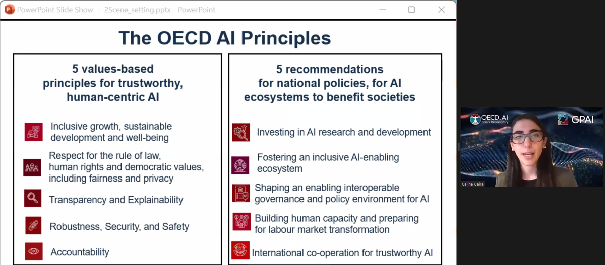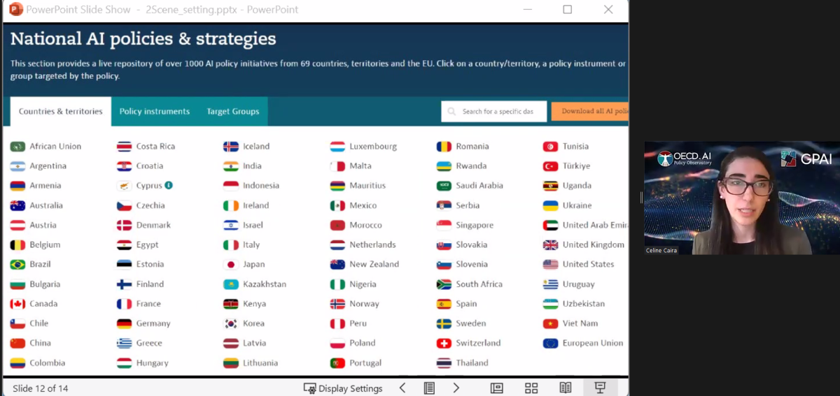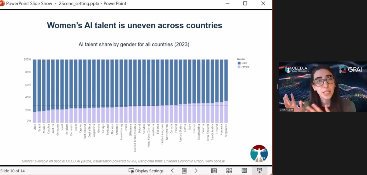 The speakers were: Rosie Goode, Lead Data Scientist for EMEA at LinkedIn's Economic Graph Research Institute; Anna Yang, Senior Director of Policy and Inclusion at Mila; Céline Keira, Economist and Policy Analyst, Artificial Intelligence Division, OECD Science, Technology and Innovation (STI) Division, Stéphane Vincent-Lancrin, Senior Analyst and Deputy Head of Division, OECD Education and Skills Directorate, and Martha Encinas-Martin, Moderator - OECD Ambassador for Gender in Education and Senior Advisor, OECD Directorate for Global Relations and Cooperation.