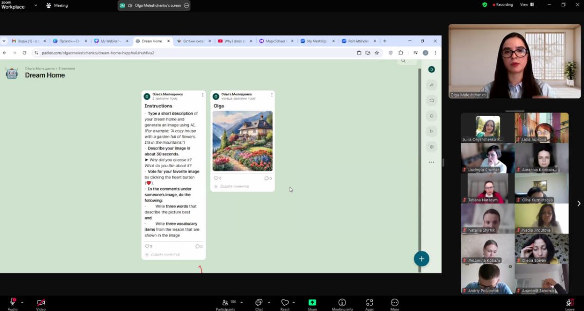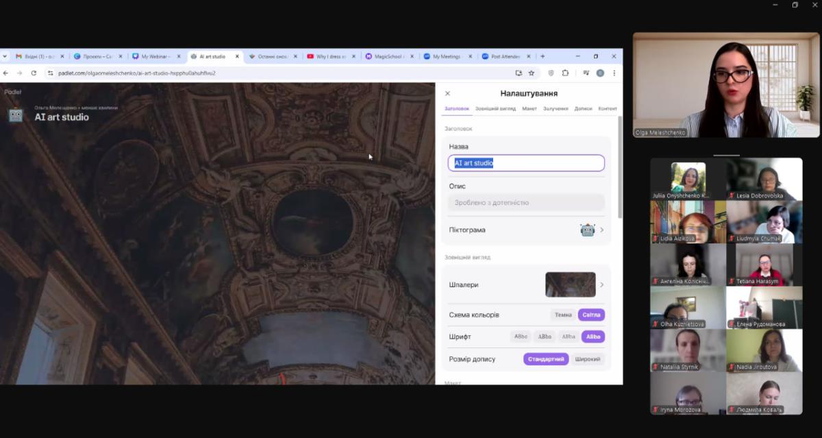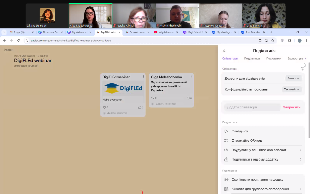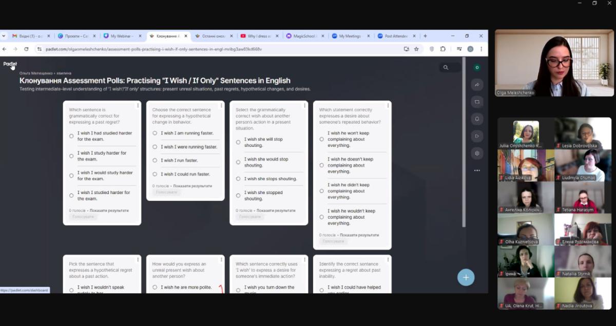 The webinar speaker − Olha Meleshchenko, PhD, Associate Professor at the Department of English Philology − showcased the practical integration of the Padlet, Miro and Magic School platforms. These tools allow to create an interactive educational environment, which is extremely useful for the development of communication skills of students.
