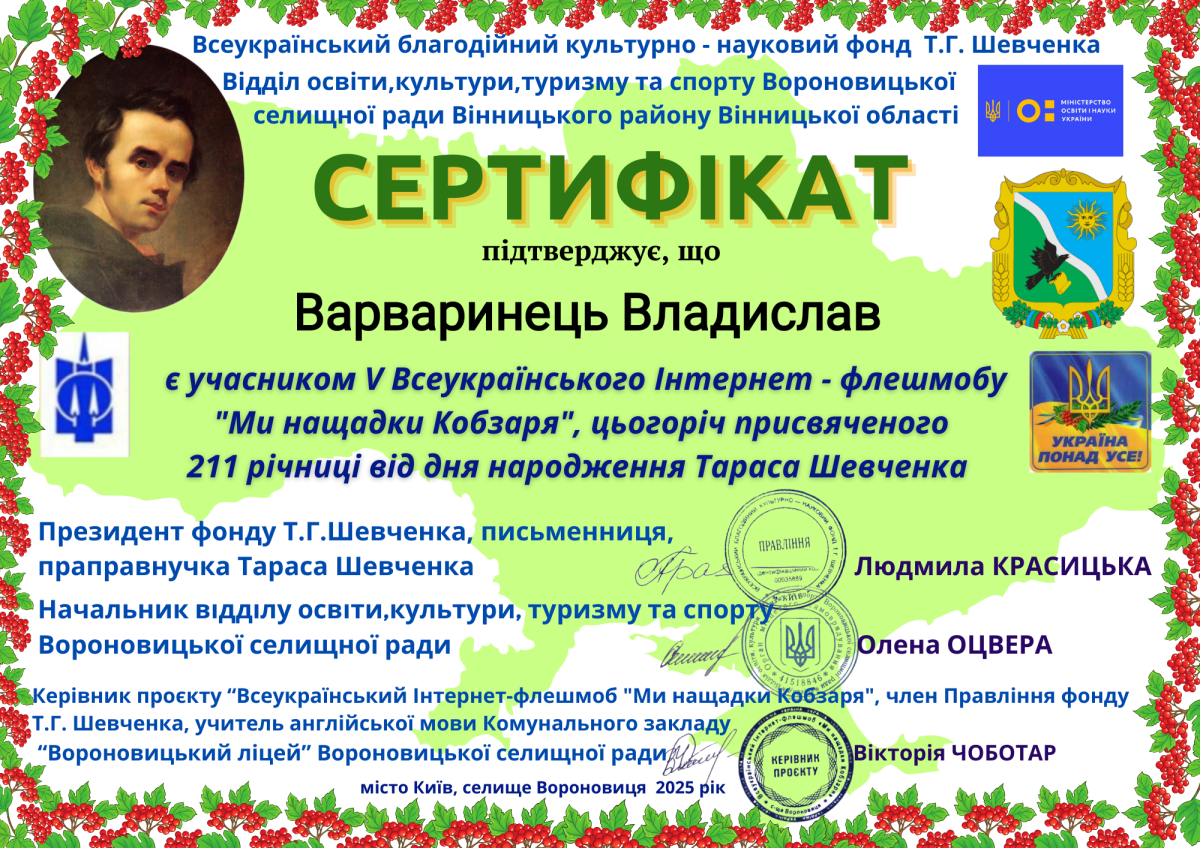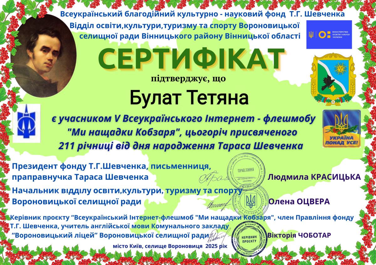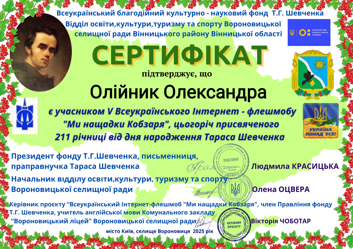 Project founders were: All-Ukrainian Charitable Cultural and Scientific Foundation of T.H. Shevchenko, Department of Education, Culture, Tourism and Sports of the Voronovytsia Village Council, Vinnytsia District, Vinnytsia Oblast.