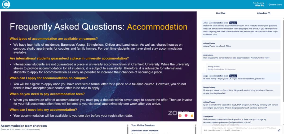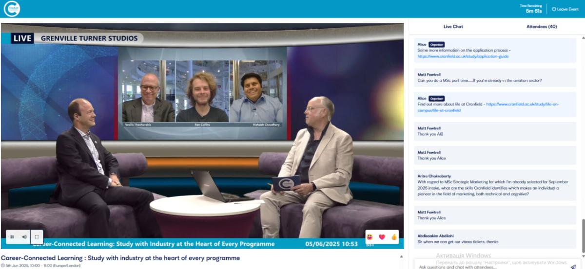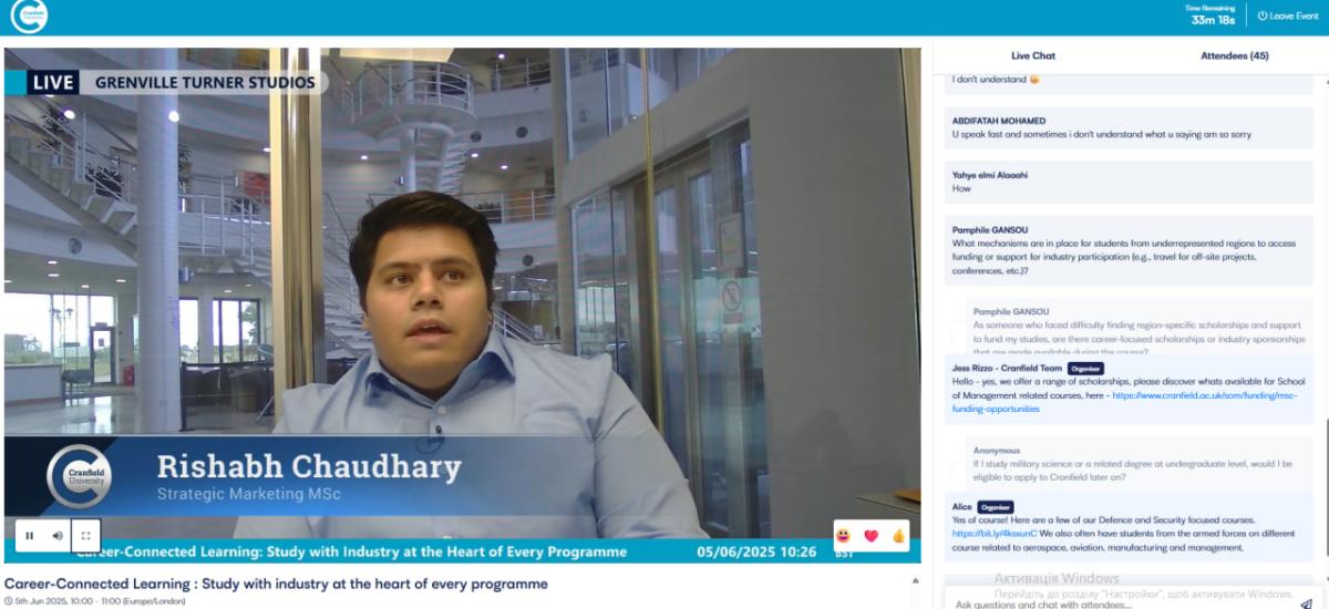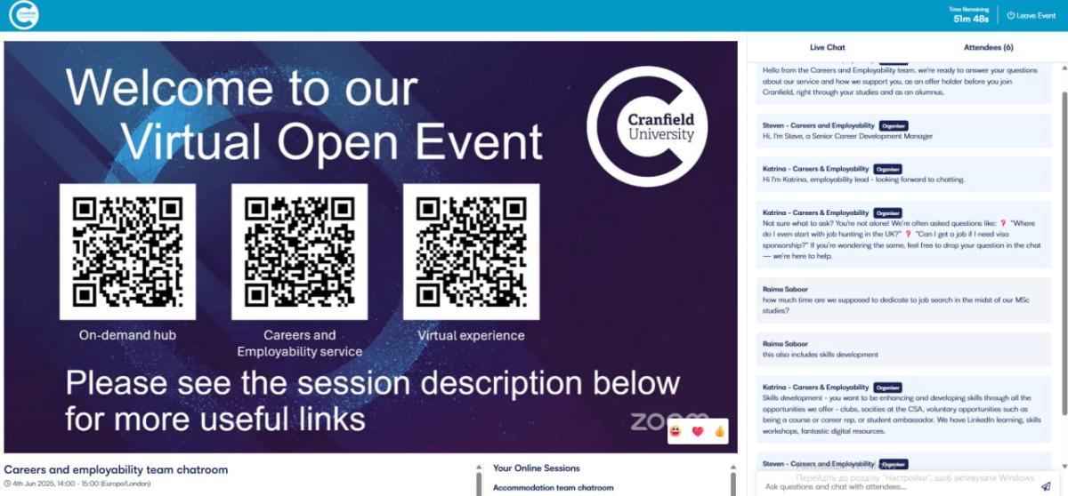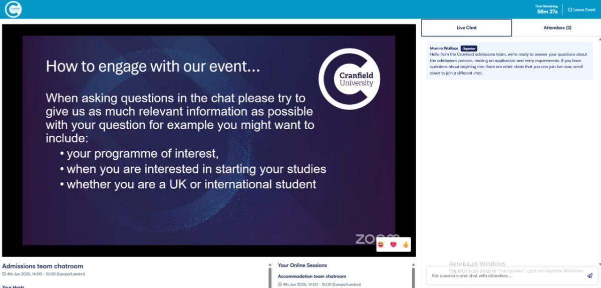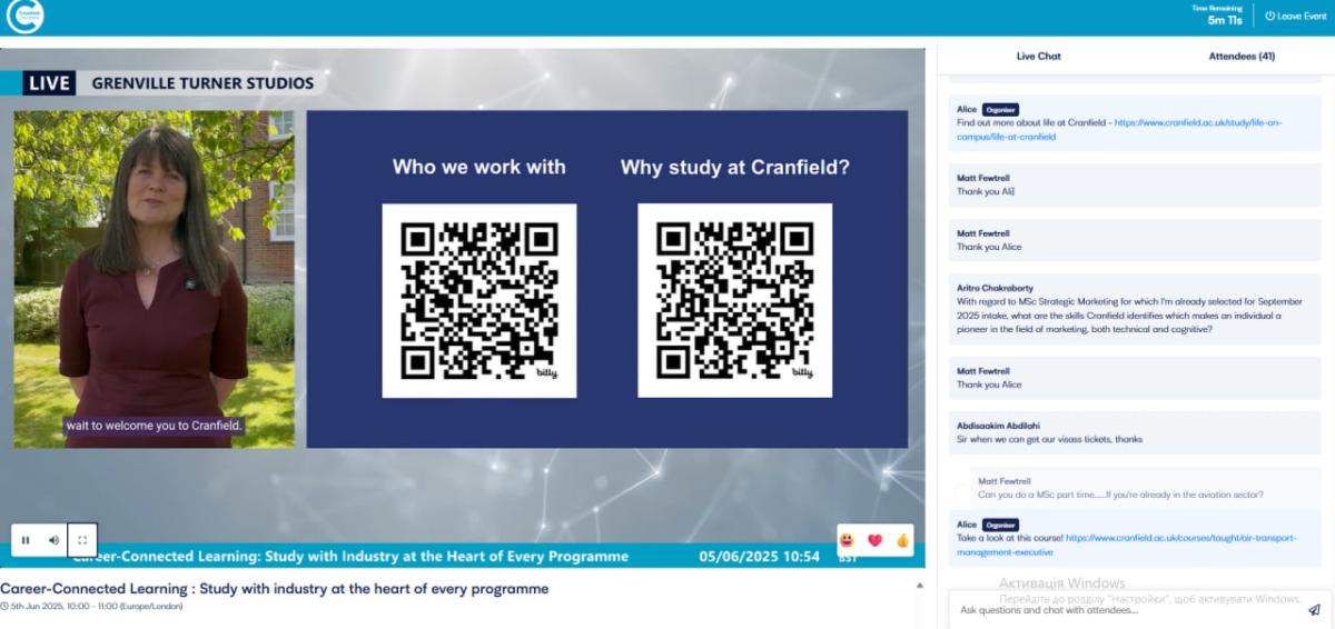 Participation in Cranfield University's Virtual Open Week contributes to the expansion of partnership and academic cooperation. This format allows participants to learn about current educational approaches, exchange professional experience and creates conditions for meaningful dialogue between educational communities.