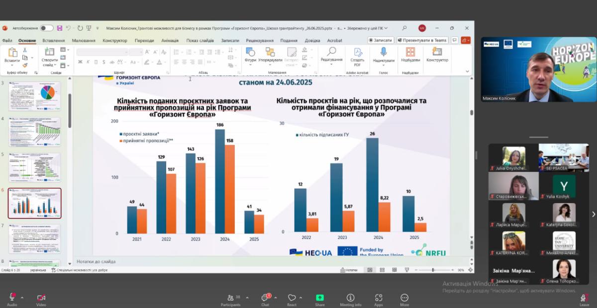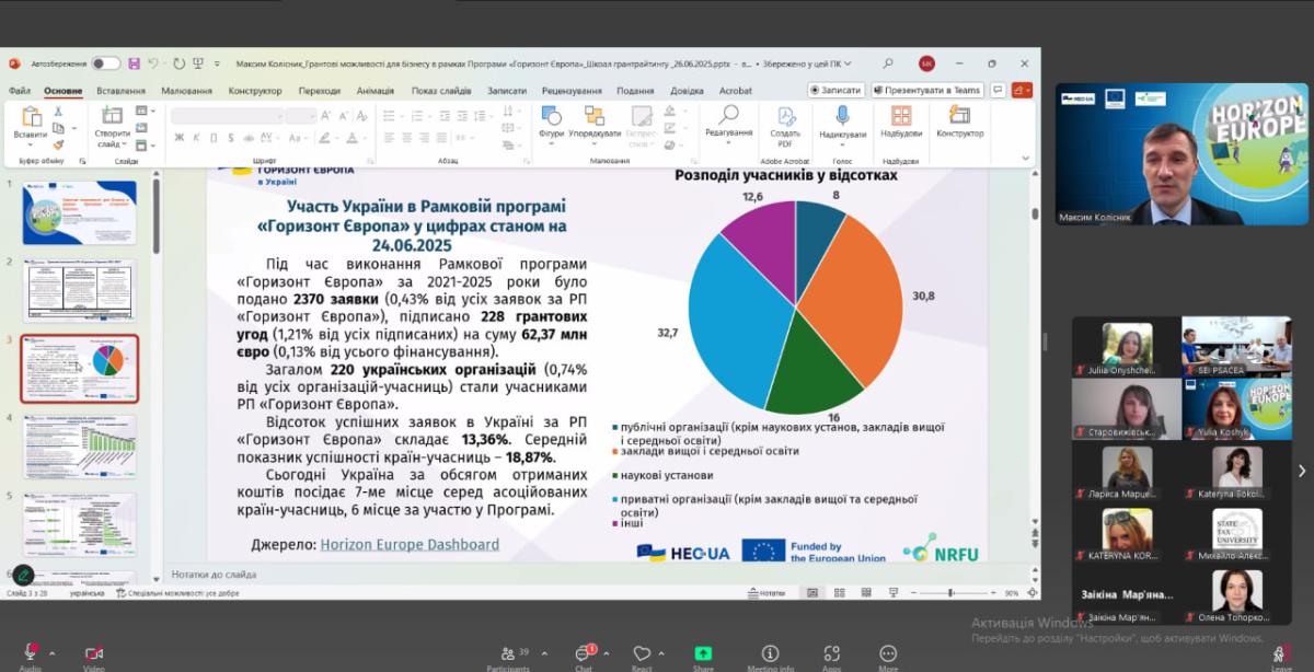 The training provided participants with a deep understanding of the grant opportunities offered by the Horizon Europe programme, opening up new perspectives for the development of scientific and educational projects. Examples of successful projects by Ukrainian universities served as inspiration, motivating active participation in grant competitions. The practical recommendations received on preparing competitive applications, will contribute to improving their quality and success.