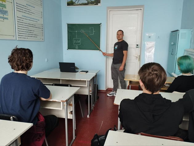 During the class, Serhii Sych introduced to students the damage and characteristics of power line modes. He talked about maximum current protection. Dmytro Shokariov talked about the current cut-off without time delay and the current cut-off with time delay.