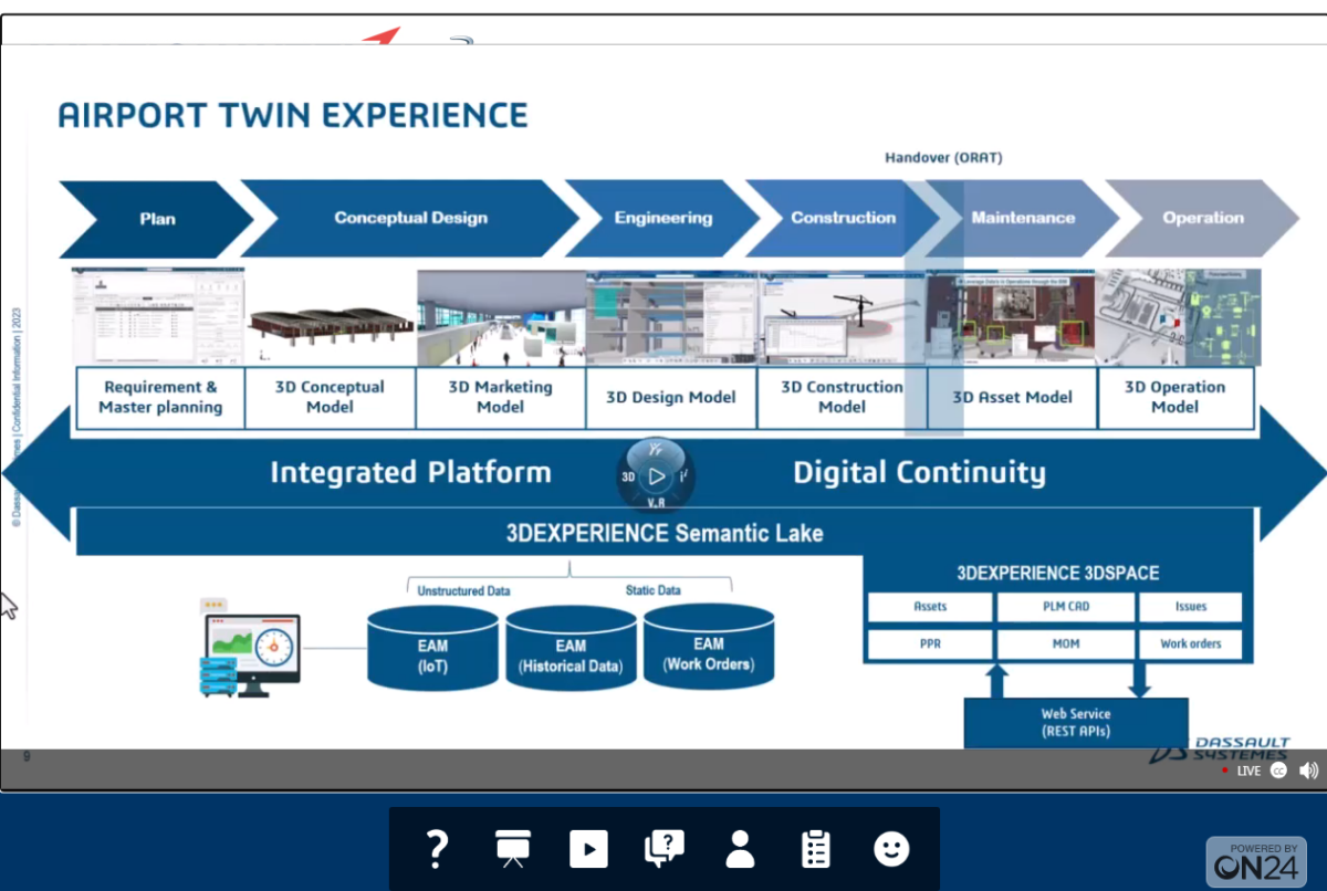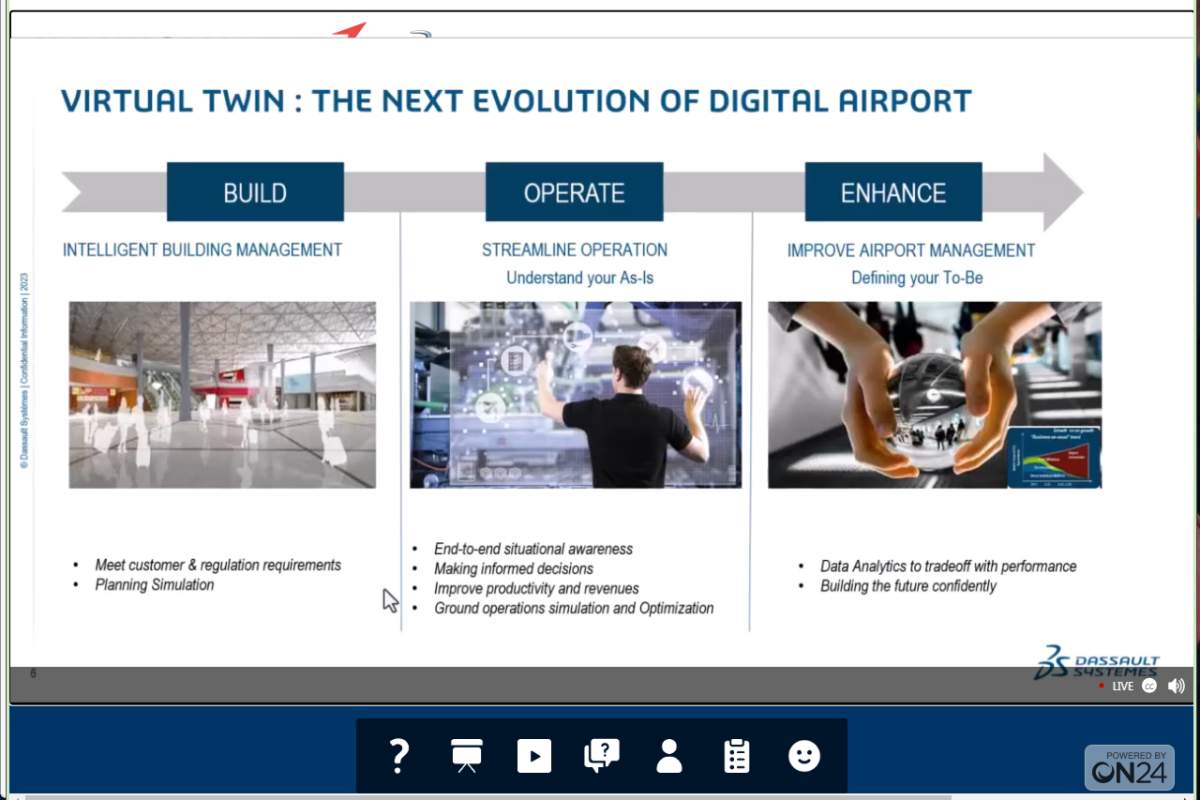 During the webinar, the following issues were discussed: modelling and optimisation of design, traffic, and maintenance of airports; real-time situational awareness for better decision-making; ensuring operational readiness through digital implementation; proactive feedback and artificial intelligence analytics; and increased sustainability and cost control through a single platform.