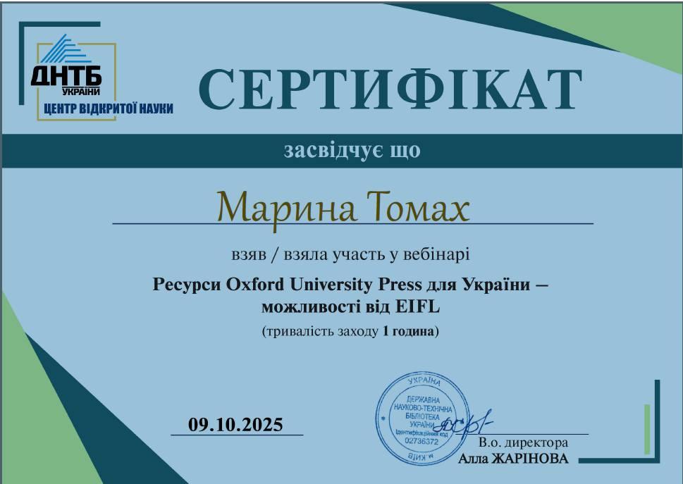 On October 9, 2025, the staff of the Public Library of the Kremenchuk Flight College of the Kharkiv National University of Internal Affairs took part in the all-Ukrainian webinar ‘Oxford University Press Resources for Ukraine – Opportunities from EIFL,’ organised by the State Scientific and Technical Library of Ukraine (DSTL) as part of the activities of the EIFL-Ukraine Consortium.