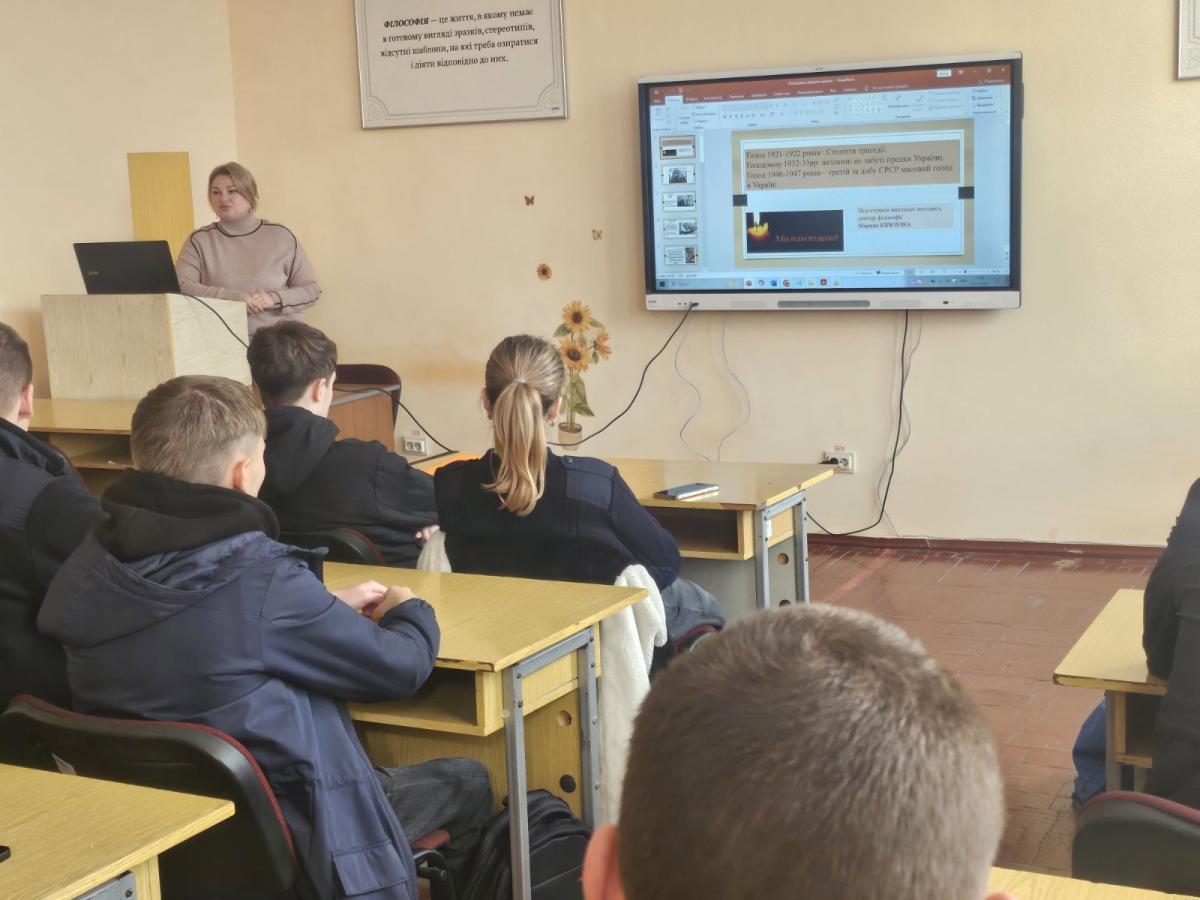 On 18 November 2025, the Kremenchuk Flight College held a round table entitled ‘Not to be forgotten: all evidence as the key to understanding the Holodomor,’ organised by Maryna Kiriukhina, head of the Department of Social Sciences, Humanities and Fundamental Disciplines, with the participation of higher education students. Liudmyla Oliinyk, head of the Scientific Activities Department, was invited to the event.