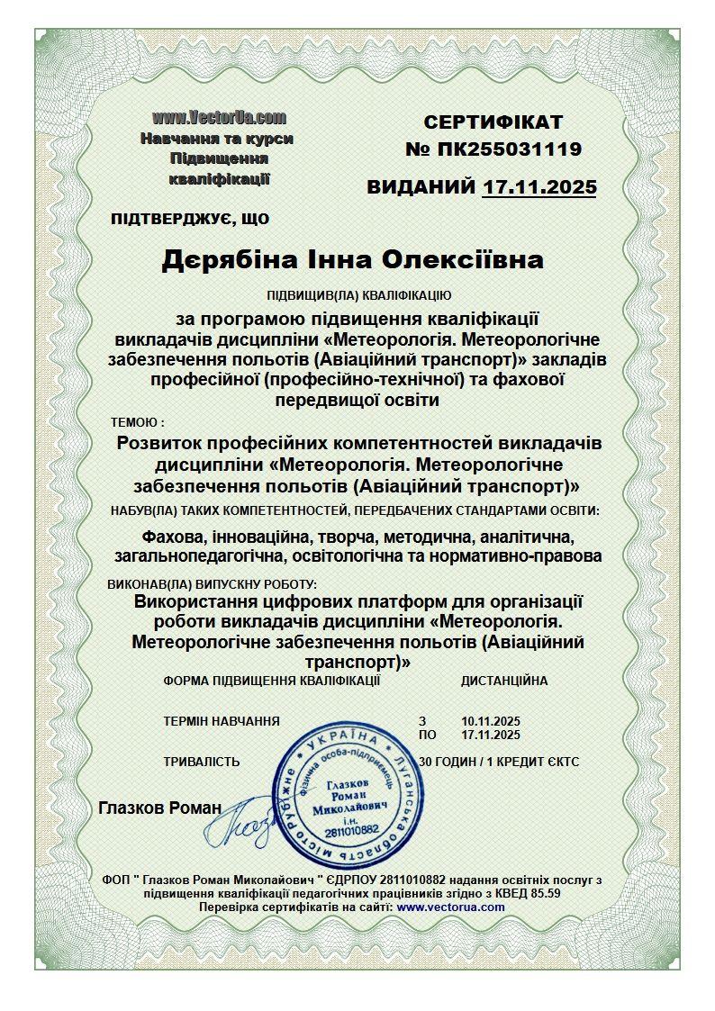 From 10 November 2025 to 17 November 2025, teachers of the Air Transport Department completed advanced training in the field of Aviation Transport. Alla Reuta advanced her skills for teaching the discipline ‘Chemistry.’ The knowledge gained and new professional competencies will contribute to the further improvement of the educational process and the quality of teaching. During the training, the teacher improved her professional competencies in: modern approaches to specialised chemistry studies; effective teaching methods and organisation of practical work for students; application of interactive technologies and laboratory methods in the educational process; formation of research skills and development of chemical literacy among students. The knowledge gained and new professional competencies will contribute to the further improvement of the educational process and the quality of teaching chemistry.