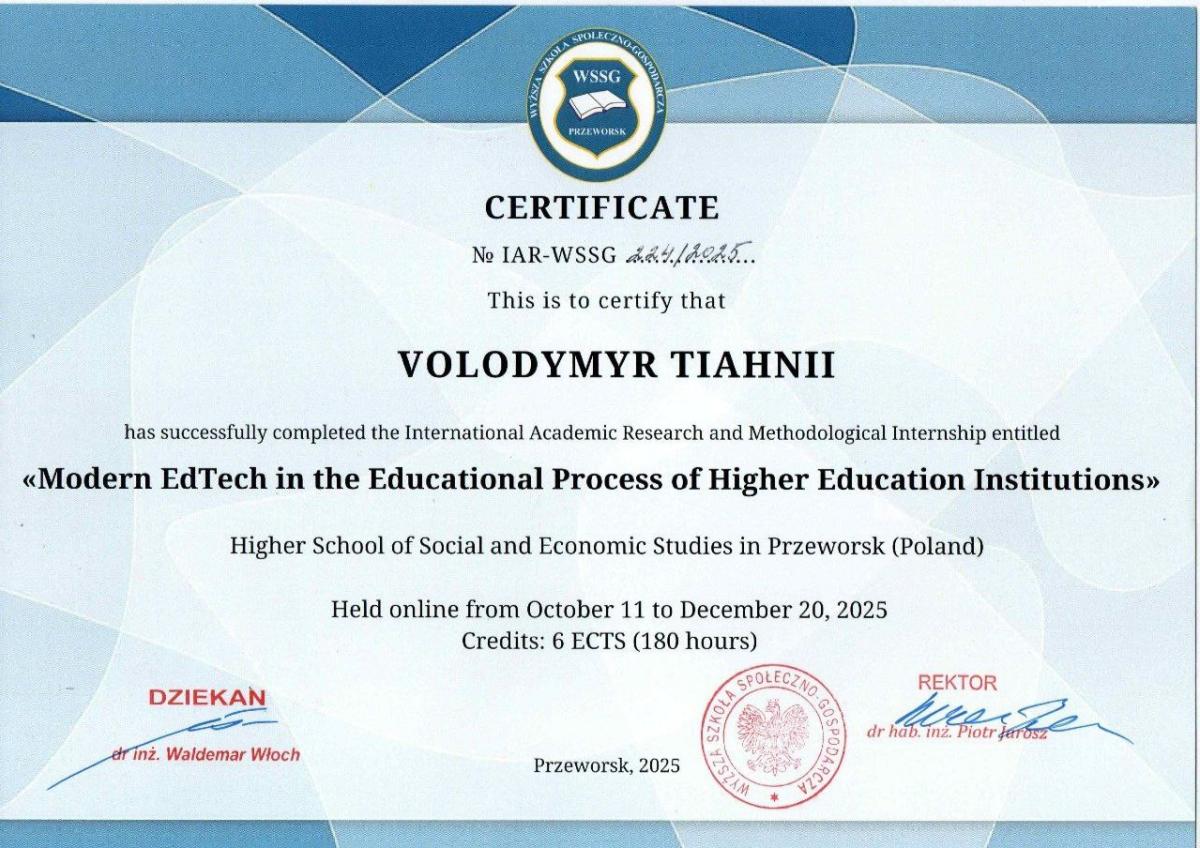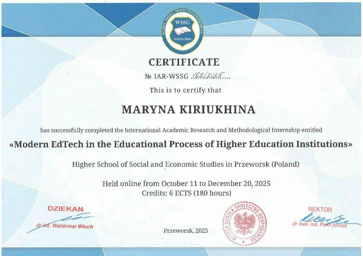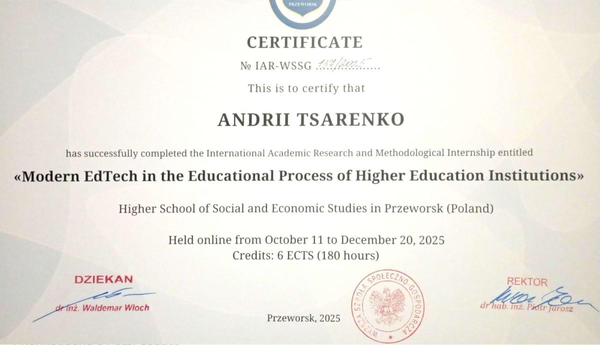 From 11 October to 20 December 2025, the staff of the Kremenchuk Flight College of the Kharkiv National University of Internal Affairs took part in an international academic internship on the topic ‘Modern EdTech in the Educational Process of Higher Education Institutions’, organised by the Higher School of Social and Economic Studies in Przeworsk (Republic of Poland). The following people took part in the internship: