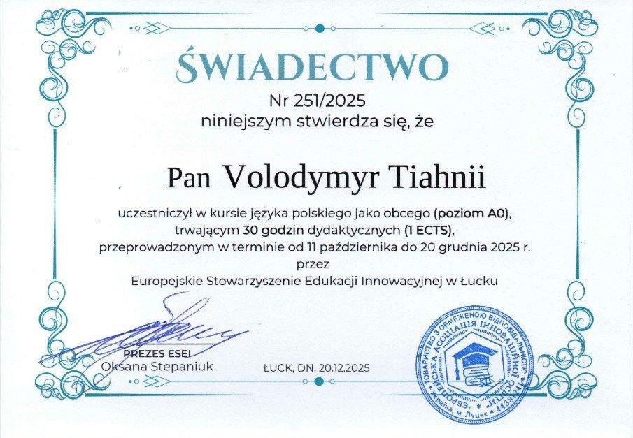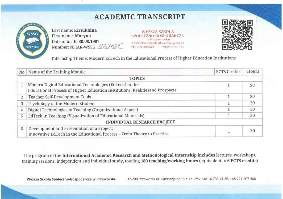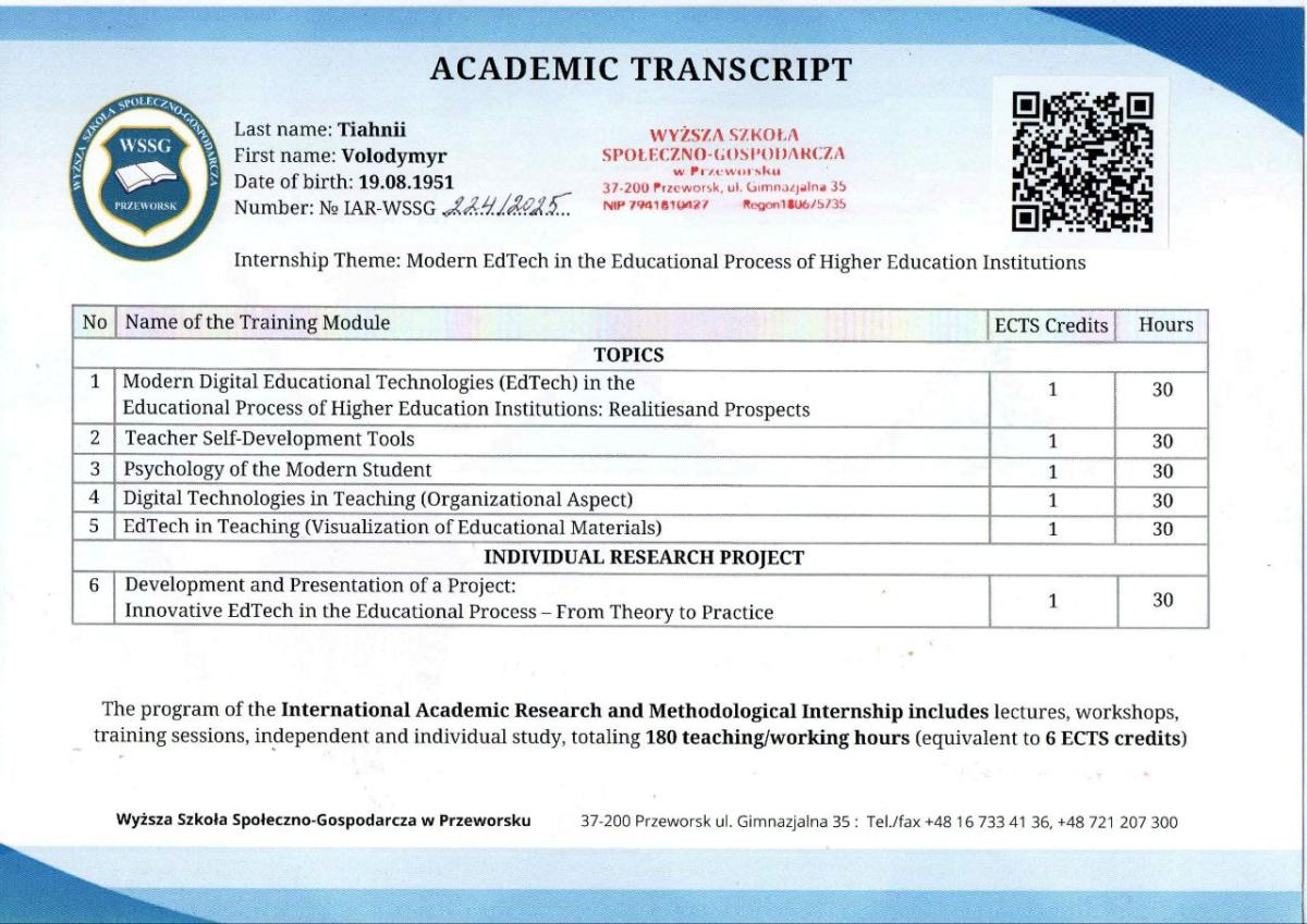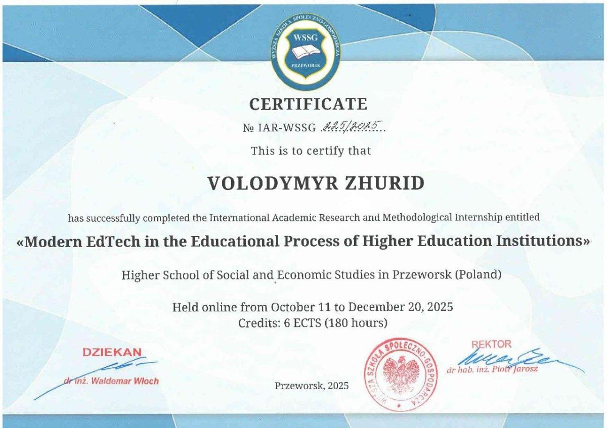 From 11 October to 20 December 2025, the staff of the Kremenchuk Flight College of the Kharkiv National University of Internal Affairs took part in an international academic internship on the topic ‘Modern EdTech in the Educational Process of Higher Education Institutions’, organised by the Higher School of Social and Economic Studies in Przeworsk (Republic of Poland). The following people took part in the internship: