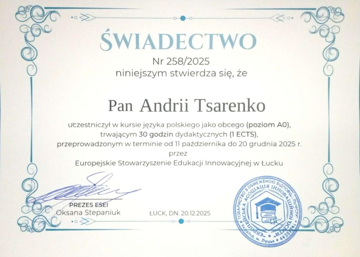 One of the areas of the internship was learning Polish at a basic level, with an emphasis on professional and academic vocabulary, which helps improve communication with Polish colleagues and expands opportunities to participate in international educational and scientific projects.