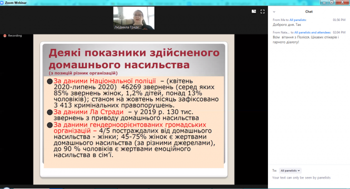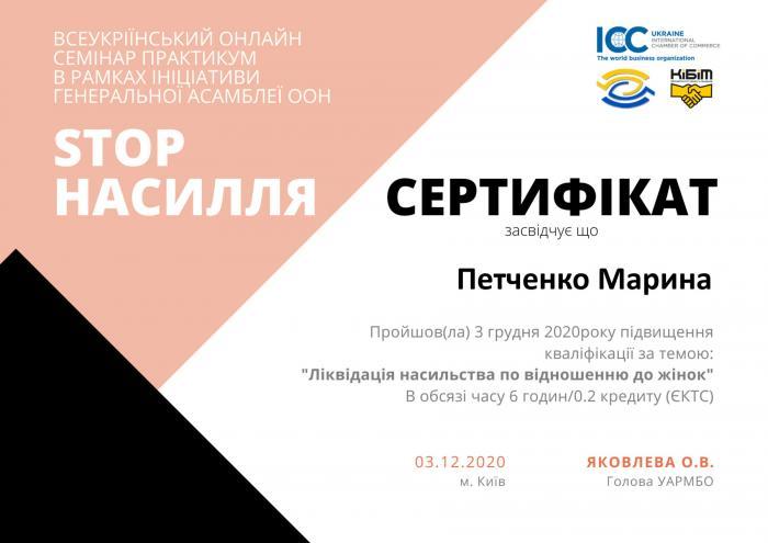 Maryna Petchenko, the Candidate of Economic Sciences, the Head of the Science Department of Kremenchuk Flight College of Kharkiv National University of Internal Affairs, took part in an online Seminar-Workshop “STOP Violence” dedicated to the International Day for the Elimination of Violence against Women. The event was organized by the Ukrainian National Committee of the International Chamber of Commerce (ICC), Kyiv Institute of Business and Technology, JSC “National Bar Association” UARMBO.