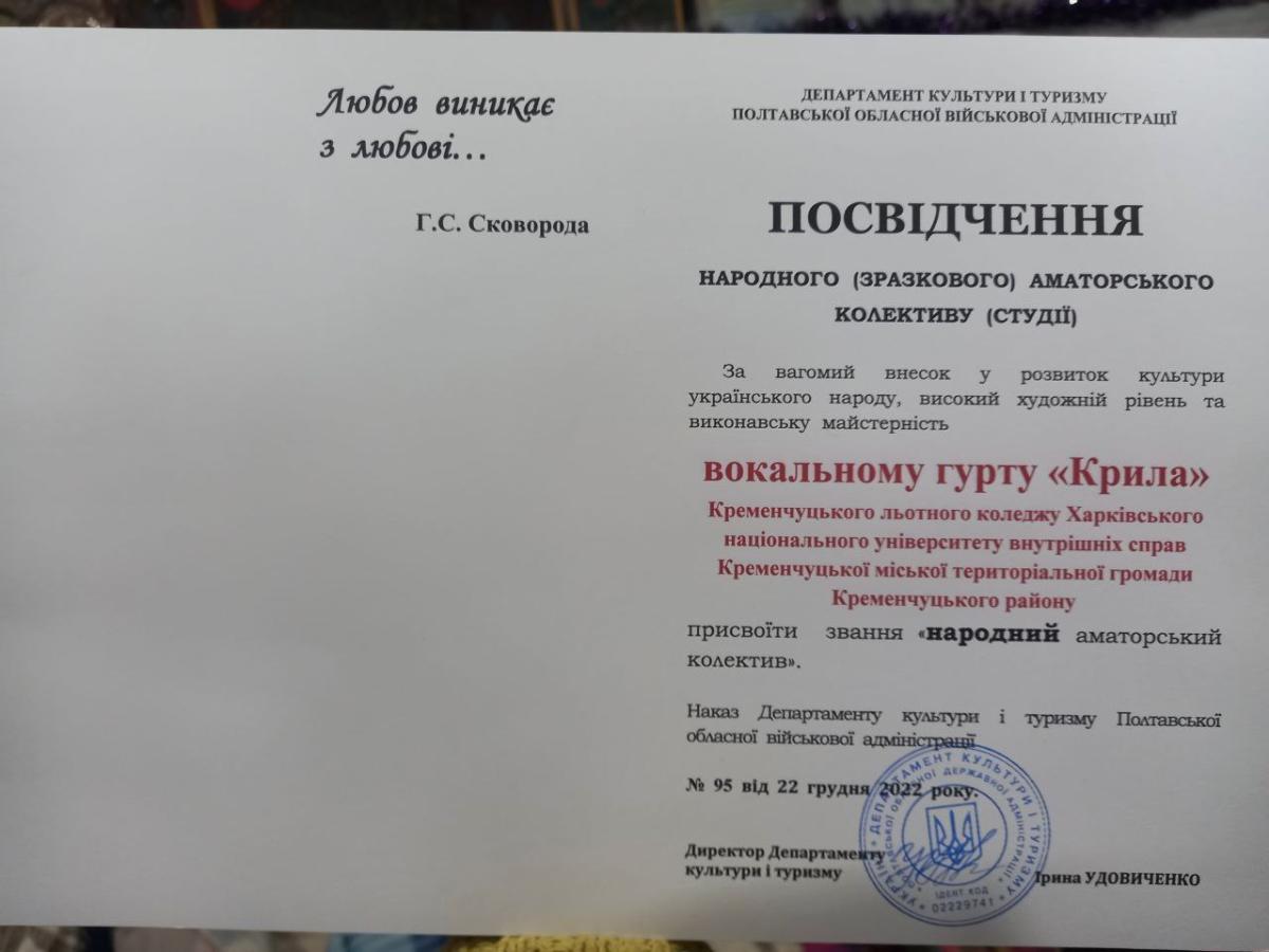 Годинний концерт у залі льотного коледжу, без світла, без апаратури і мікрофонів, лише з колонкою на акумуляторах (озвучення через телефон) довів, що талановитим потрібен тільки глядач. У захваті від рівня вокально-естетичної культури, від чистоти звучання колективу, журі присвоює «Крилам» звання «народний». Про це свідчить «Посвідчення» Департаменту культури і туризму Полтавської обласної військової адміністрації та наказ департаменту № 95.