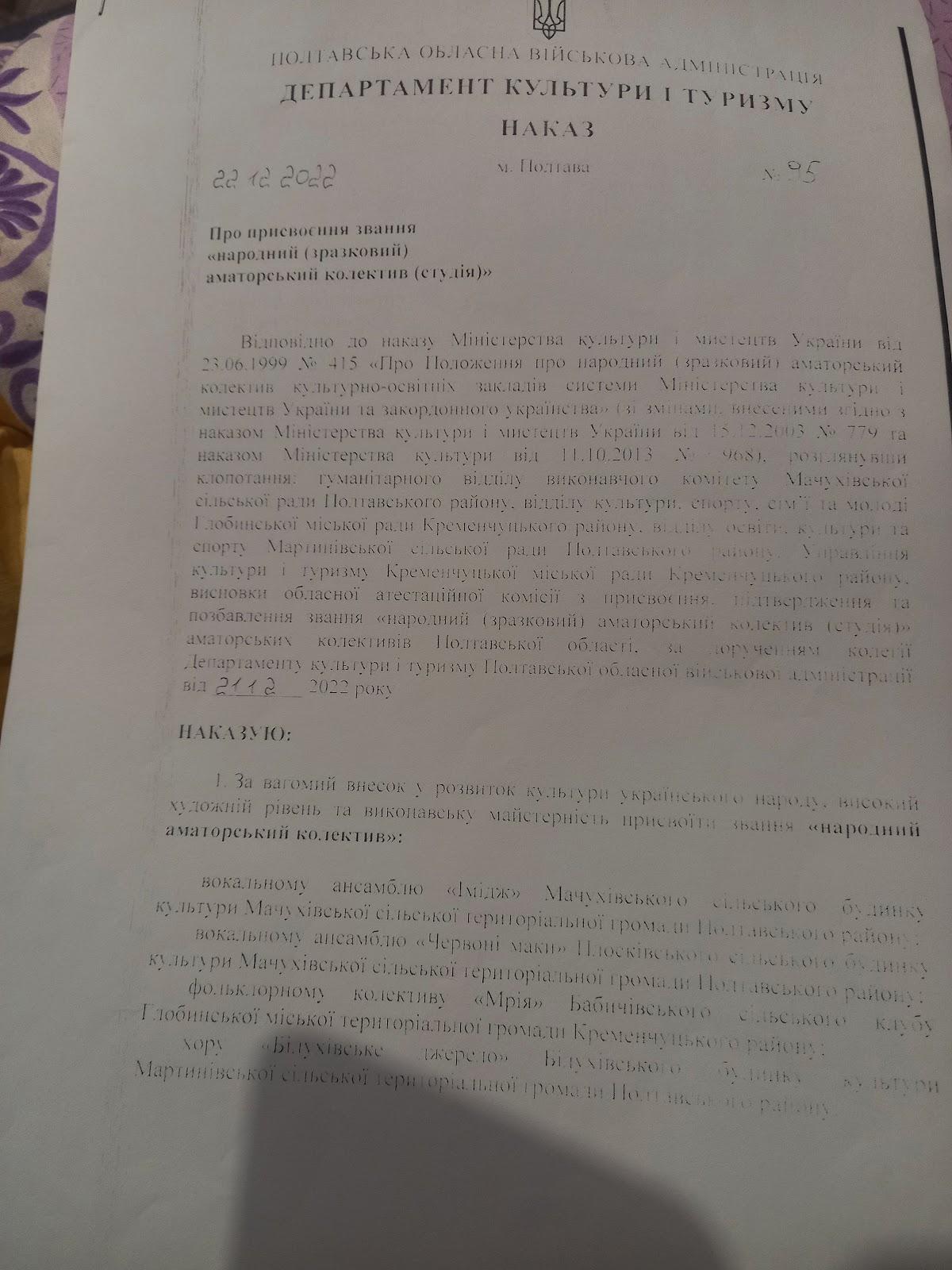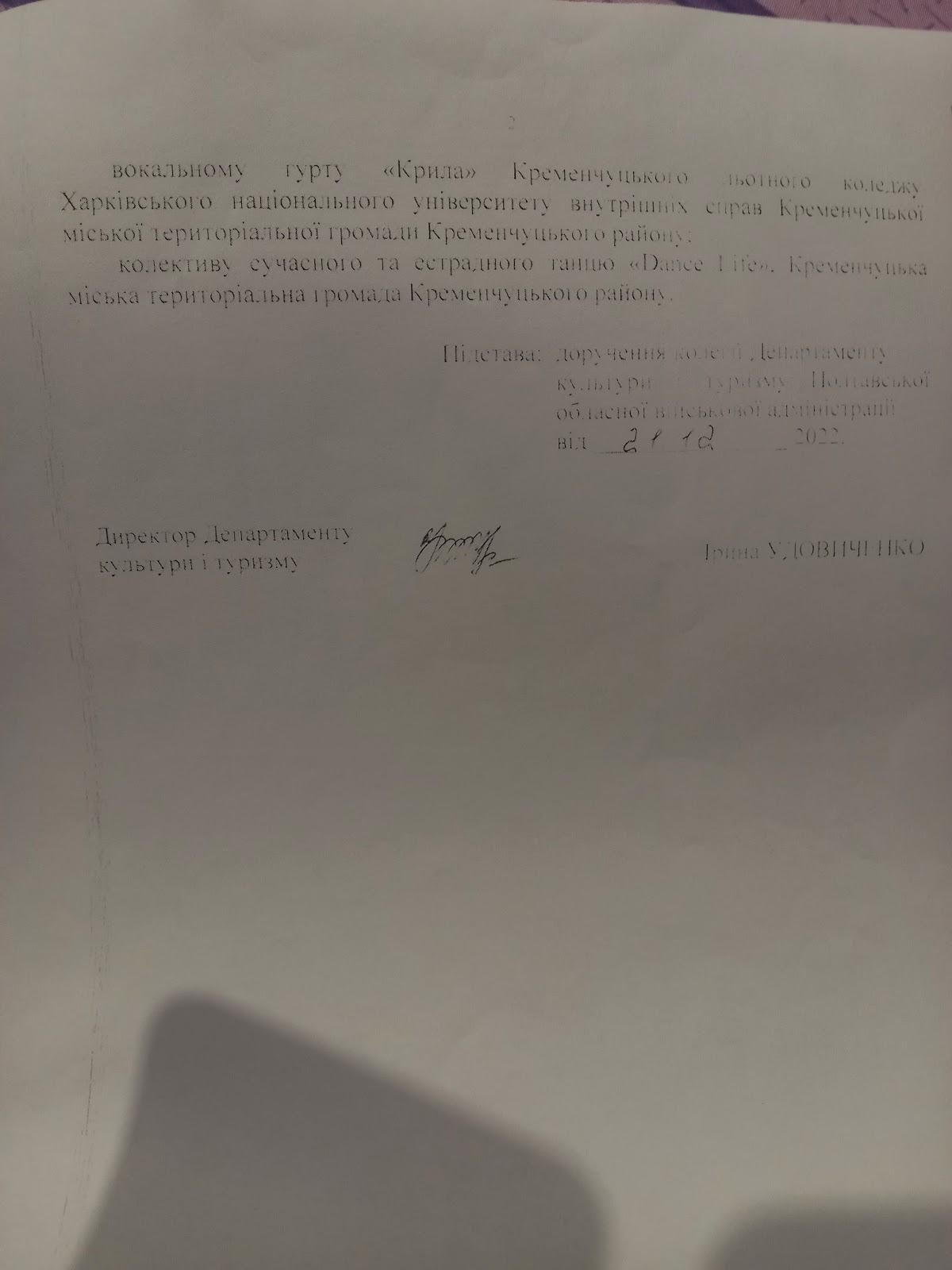 Грудень 2022 року. Комісія у складі директора обласного будинку народної творчості Соколова Дмитра Олександровича, його заступниці Олени Мунхунівни та ще декількох фахівців вокального та хореографічного мистецтва, виїхала до Кременчуцького льотного коледжу. Але повномасштабна сирена повернула їх додому, до Полтави.