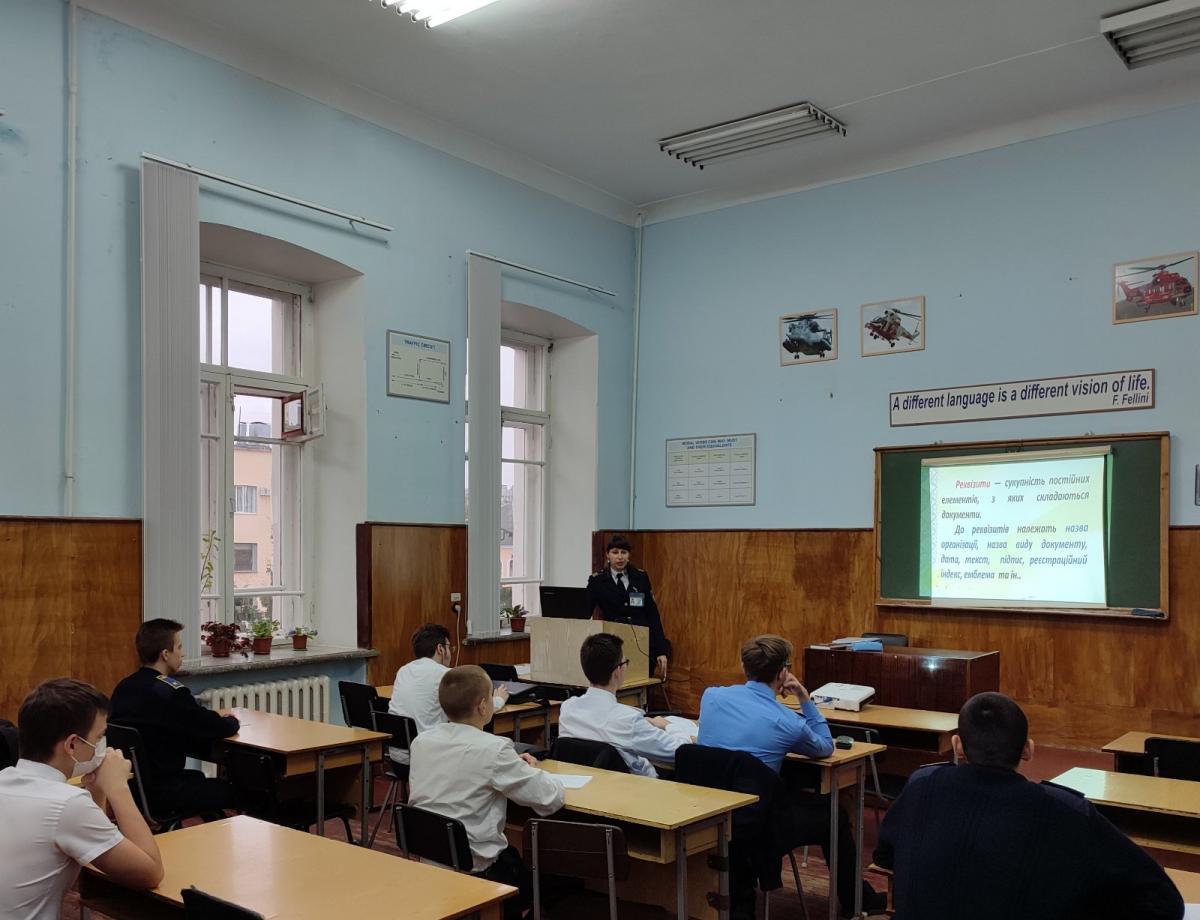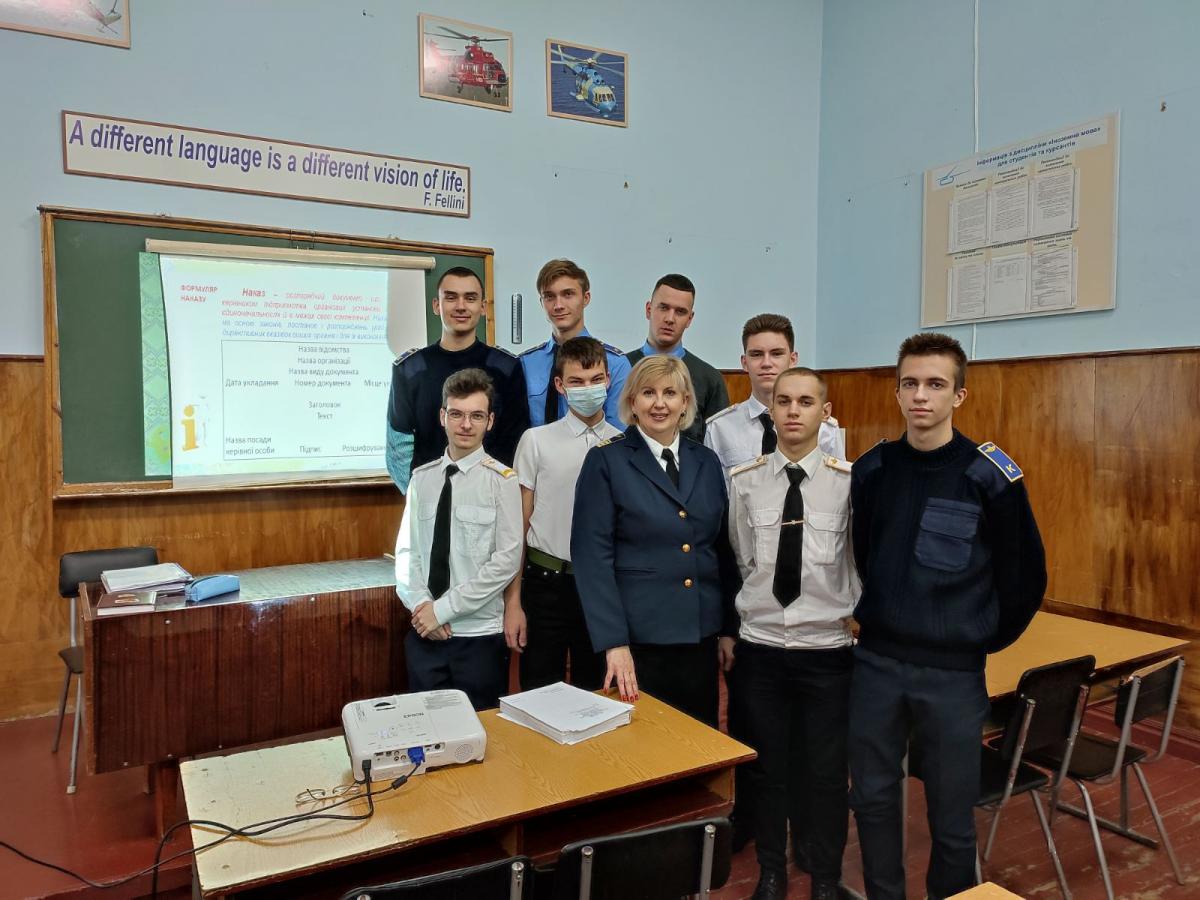 Викладачка циклової комісії філологічних дисциплін Віра Сіора за участі фахівчині відділення документального забезпечення Кременчуцького льотного коледжу Харківського національного університету внутрішніх справ Інни Пержан провела бінарне заняття з курсантами з навчальної дисципліни «Українська мова (за професійним спрямуванням)» за темою «Складання професійних документів».