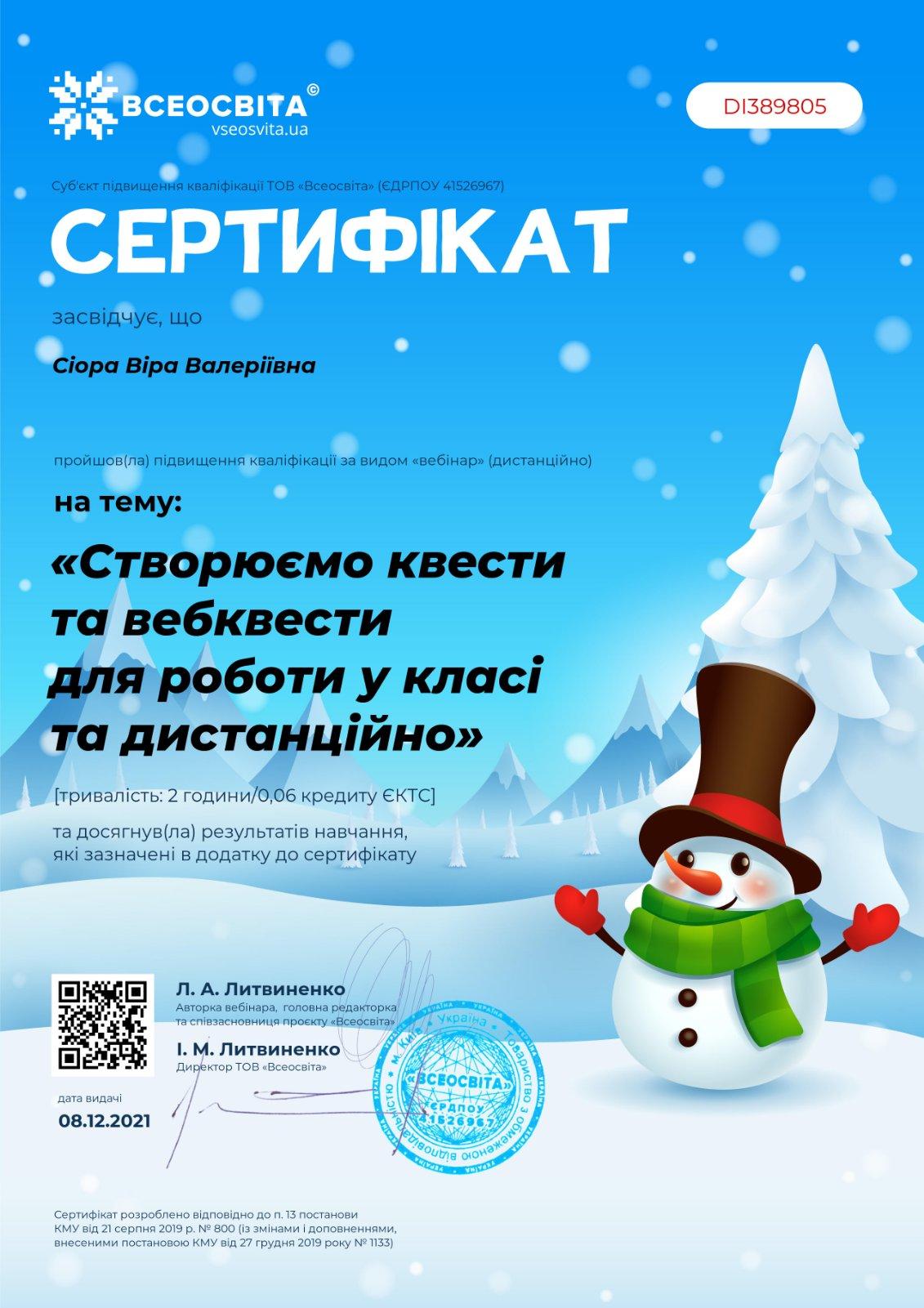 Пройшовши навчання за програмою підвищення кваліфікації (участь у вебінарі), викладачка Віра Сіора вдосконалила навички володіння сучасними інформаційними та веб технологіями; ознайомилася зі способами реалізації інноваційної діяльності за допомогою цифрових технологій, удосконалення оригінального підходу до власної життєво-професійної діяльності; здобула знання і розуміння алгоритму створення квестів та вебквестів, що допоможе їй в організації та проведенні практичної роботи на заняттях з дисциплін, які викладає.