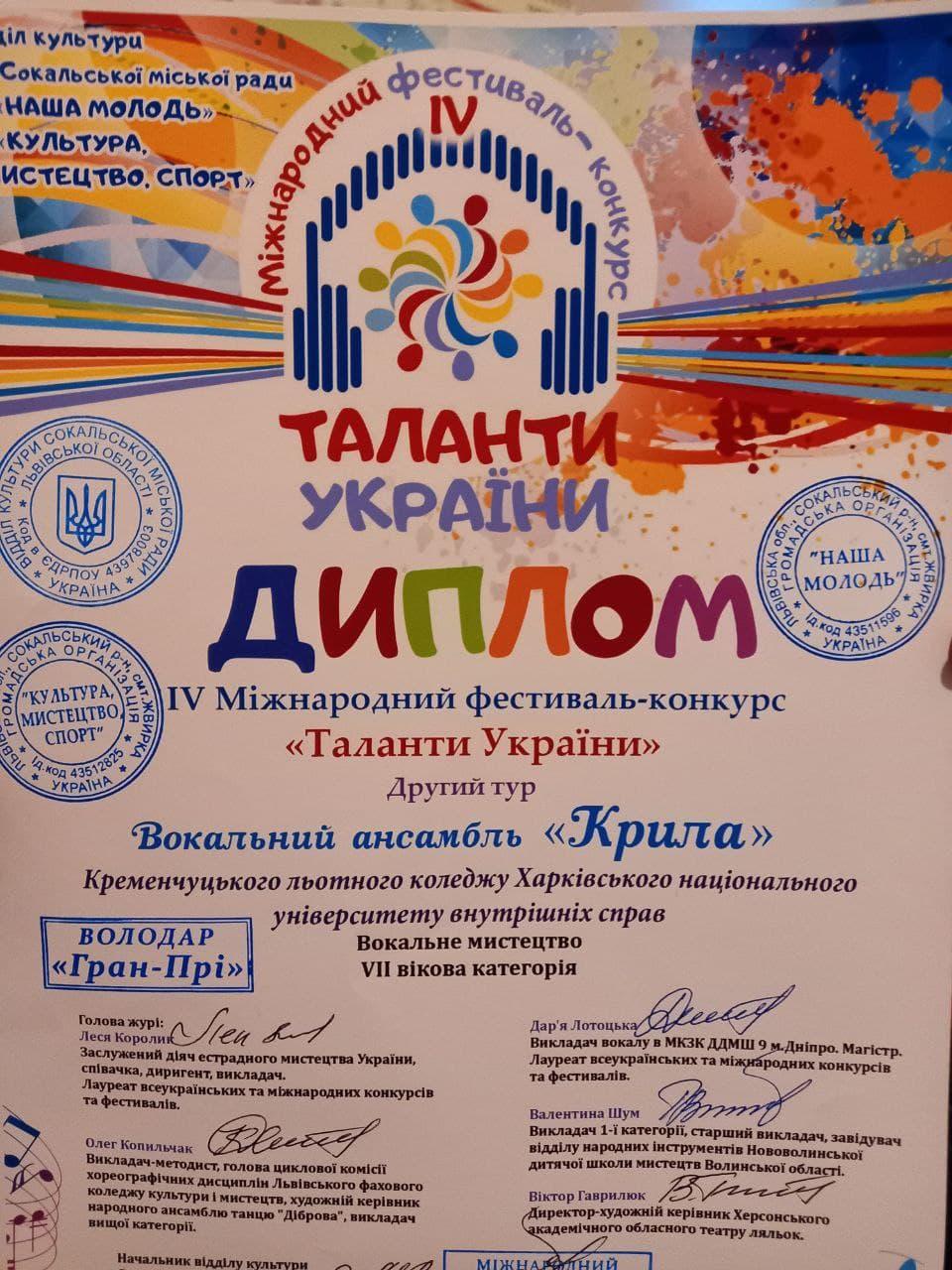 Вокальний ансамбль "Крила" на чолі з керівником Тетяною Булат взяв участь у IV Міжнародному фестивалі-конкурсі "Таланти України". Наш колектив гідно захистив честь Кременчуцького льотного коледжу ХНУВС та завоював найвищу нагороду у цьому масштабному, професійному заході - ГРАН -ПРІ!!!