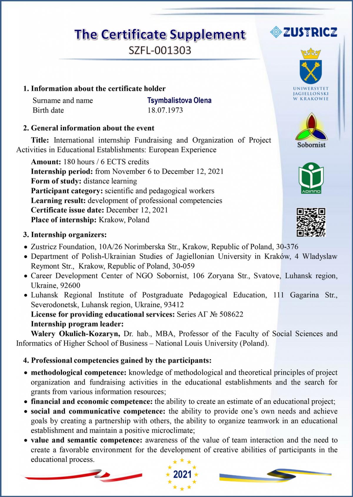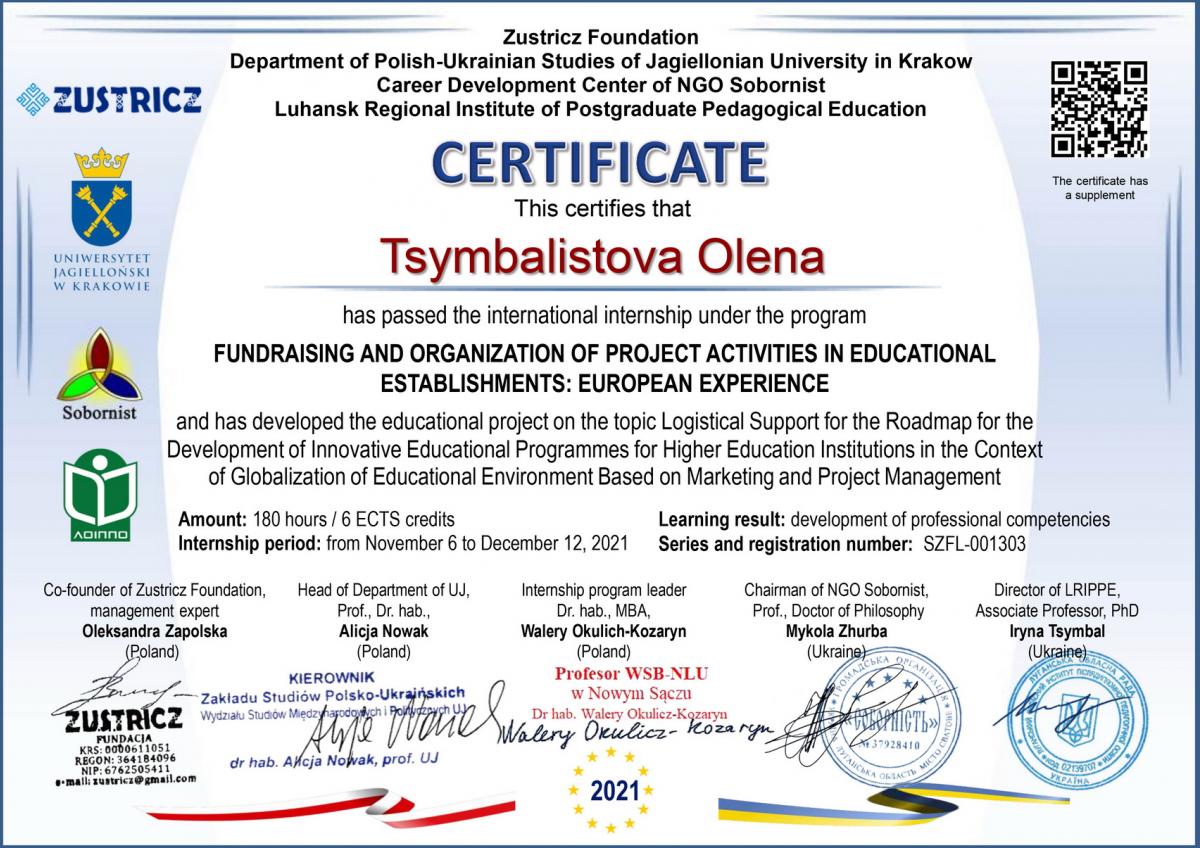 Старша викладачка циклової комісії економіки та управління, кандидатка економічних наук, спеціалістка вищої категорії, викладачка-методистка Олена Цимбалістова разом з викладачкою другої категорії циклової комісії економіки та управління Оленою Черніховою дистанційно пройшли міжнародне стажування за програмою підвищення кваліфікації «Фандрейзинг та організація проєктної діяльності в закладах освіти: європейський досвід», що відбулося на базі кафедри Польсько-Українських Студій Ягеллонського Університету (м. Краків, Польща) із залученням громадської організації «Соборність» (Україна).