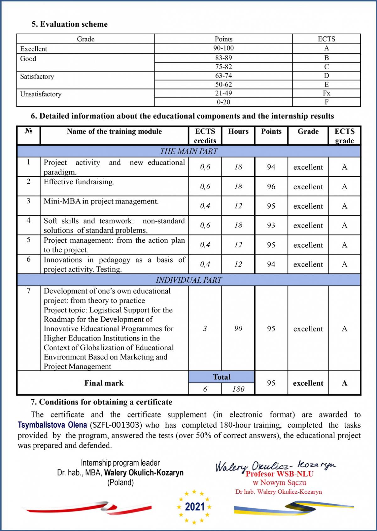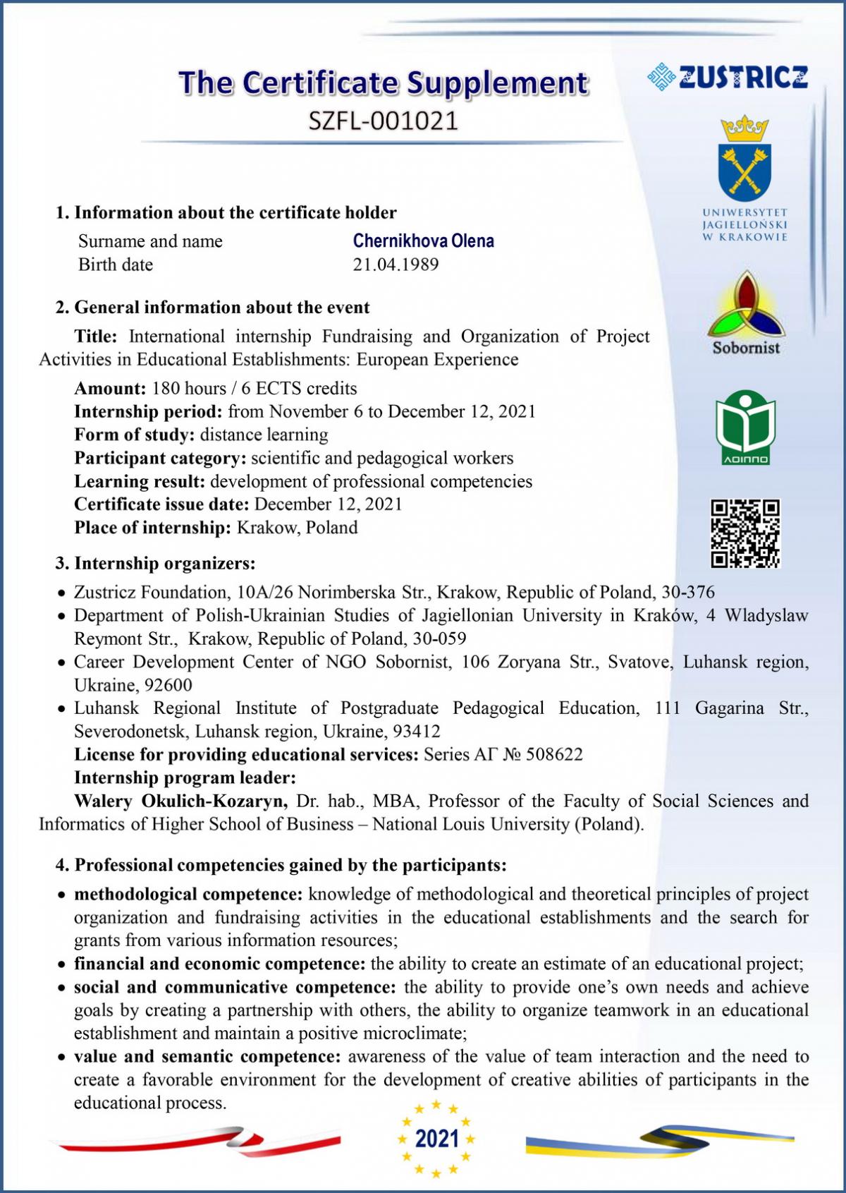 Стажування тривало з 6 листопада по 12 грудня 2021 року та включає 180 годин (6 кредитів ECTS). За результатами стажування викладачі отримали міжнародні сертифікати.