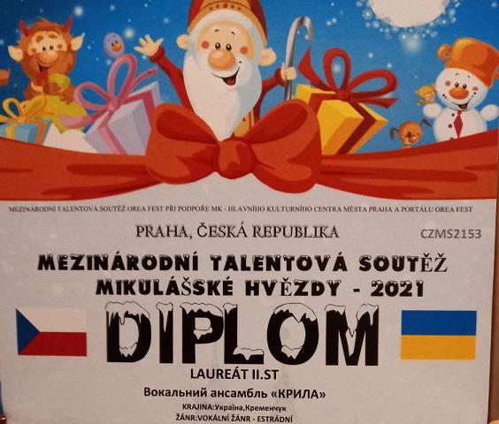 Вокальний ансамбль «Крила» Кременчуцького льотного коледжу Харківського національного університету внутрішніх справ під керівництвом Тетяни Булат за результатами участі у Міжнародному фестивалі-конкурсі Чехія–Україна «Миколайські Зірки» посів ІІ місце.