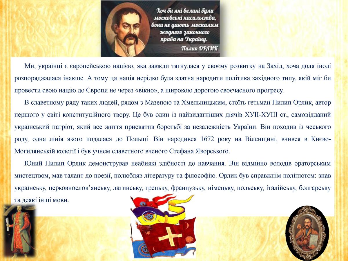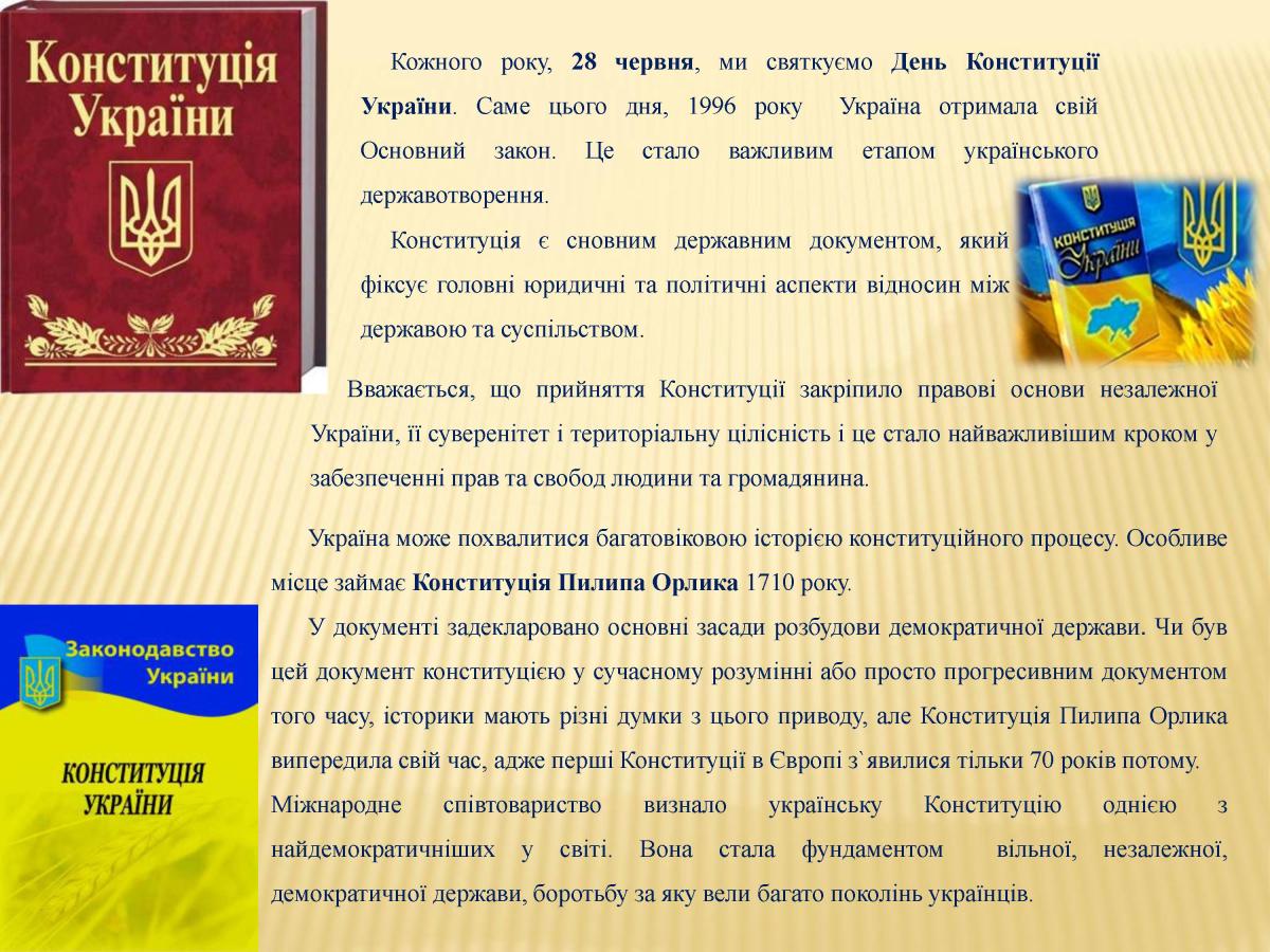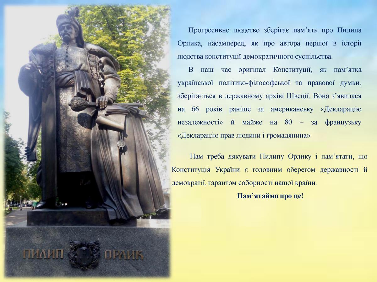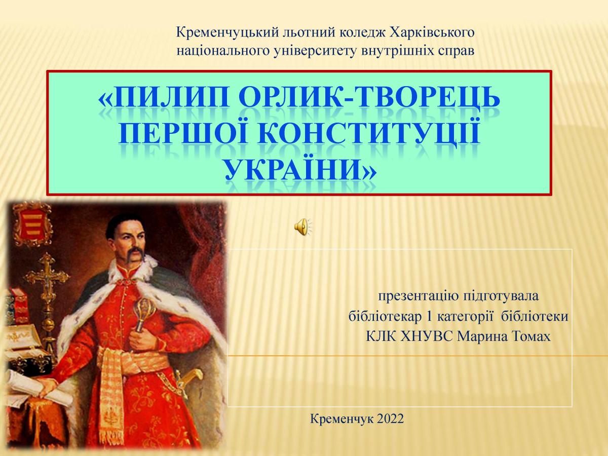 Кожного року, 28 червня, ми святкуємо День Конституції України. Саме цього дня, 1996 року Україна отримала свій Основний закон. Це стало важливим етапом українського державотворення. Ядром національної правової системи держави є саме Конституція. З цієї нагоди бібліотека КЛК ХНУВС підготувала електронну слайд-презентацію «Пилип Орлик – творець першої Конституції України»