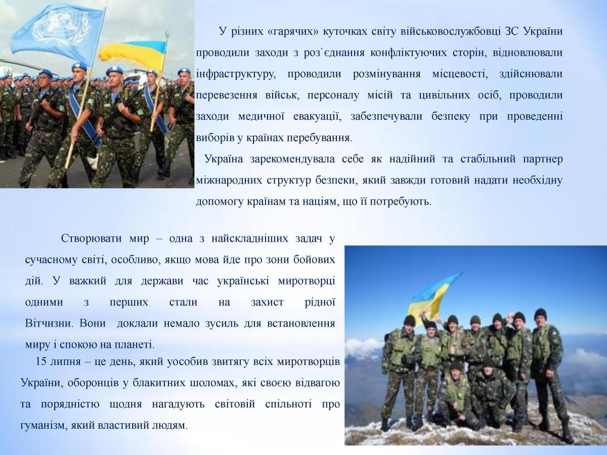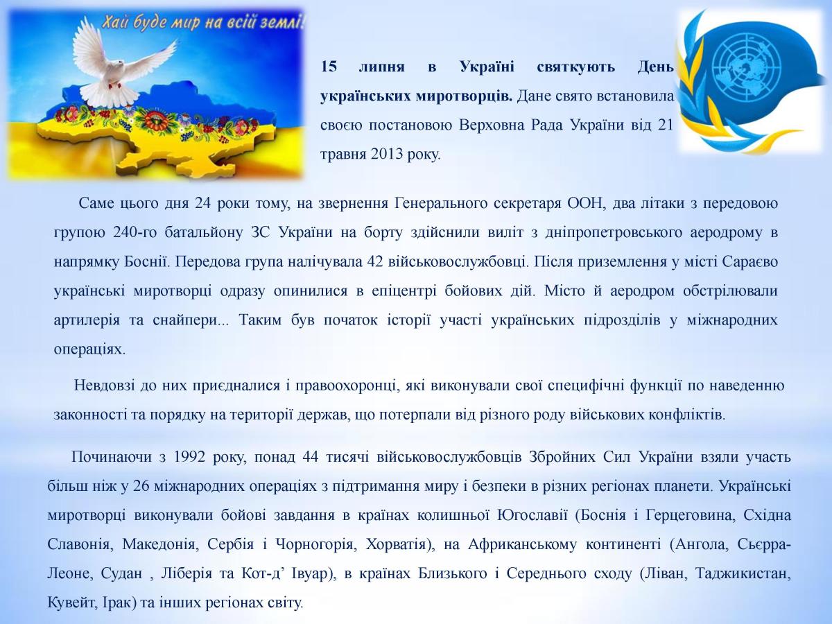 21 травня 2013 року, одноголосно прийняла Постанову № 292-VII «Про встановлення Дня українських миротворців». Постановою визначено 15 липня Днем українських миротворців з подальшим відзначенням його на державному рівні, з метою вшануванням мужності і звитяги, зразкового виконання службових обов'язків, вірності присязі учасників миротворчих операцій та забезпечення збереження пам'яті славетних героїв-миротворців, які загинули під час виконання обов'язків у складі миротворчого контингенту та миротворчого персоналу.