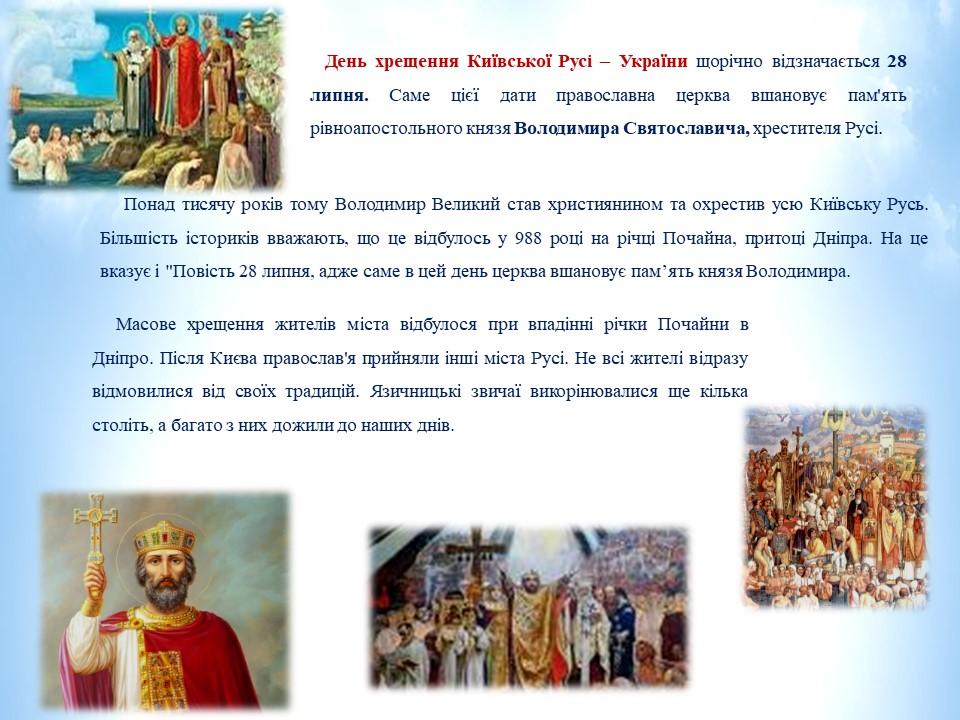 28 липня – День Хрещення Київської Русі-України. Це офіційне свято, затверджене 25 липня 2008 року Указом Президента України (за каденції Віктора Ющенка). З нагоди цієї дати в бібліотеці КЛК ХНУВС обладнана книжкова виставка «Хрещення Київської Русі»