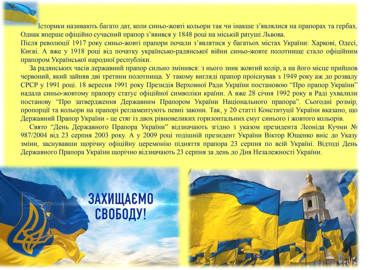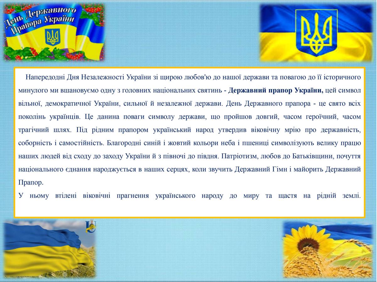Напередодні Дня Незалежності України зі щирою любов'ю до нашої держави та повагою до її історичного минулого ми вшановуємо одну з головних національних святинь - Державний прапор України, цей символ вільної, демократичної України, сильної й незалежної держави. День Державного прапора - це свято всіх поколінь українців. Це данина поваги символу держави, що пройшов довгий, часом героїчний, часом трагічний шлях. Під рідним прапором український народ утвердив віковічну мрію про державність, соборність і самостійність. Благородні синій і жовтий кольори неба і пшениці символізують велику працю наших людей від сходу до заходу України й з півночі до півдня. Патріотизм, любов до Батьківщини, почуття національного єднання народжується в наших серцях, коли звучить Державний Гімн і майорить Державний Прапор.