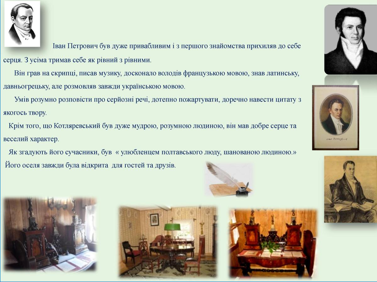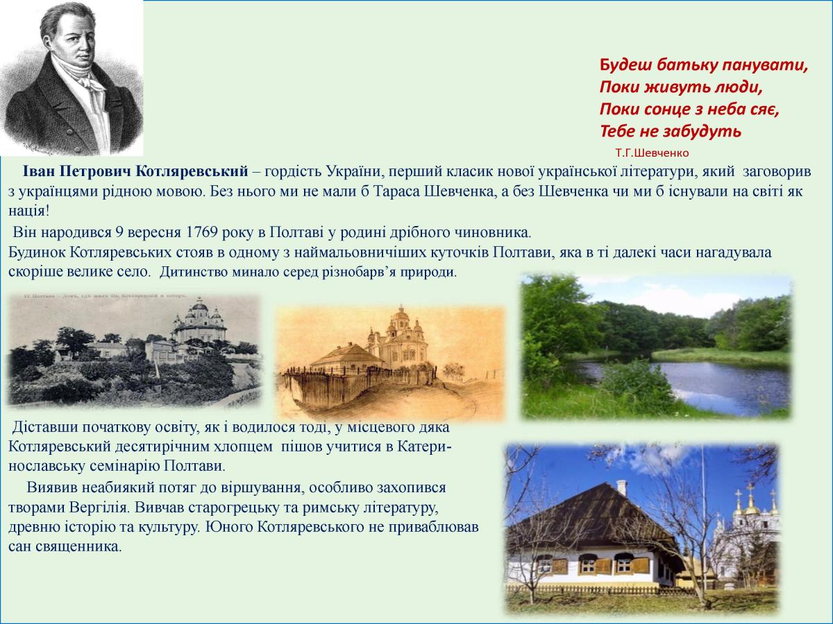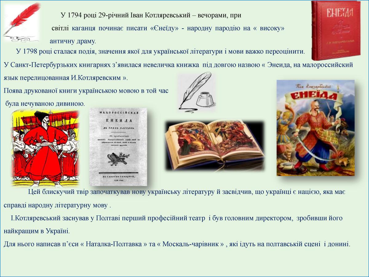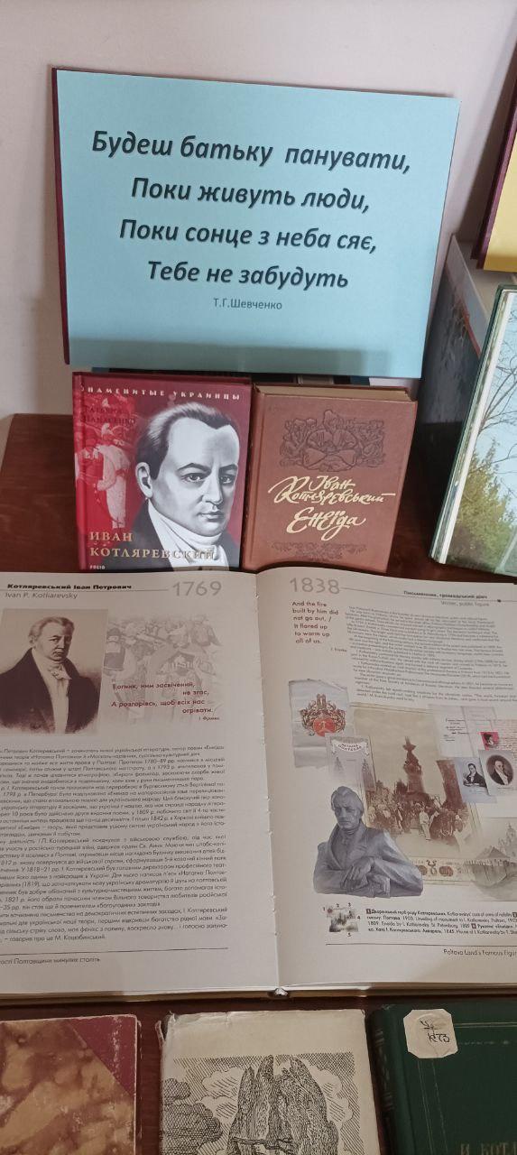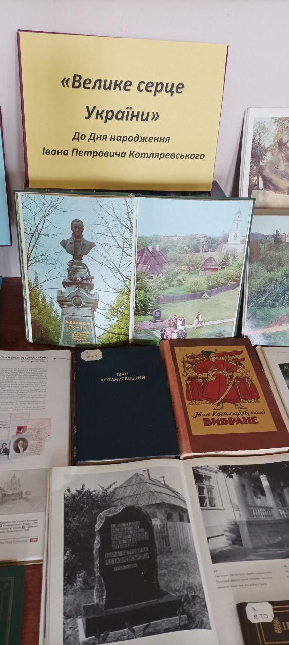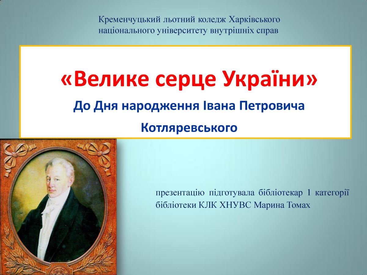 9 вересня 1769 в Полтаві народився видатний український письменник, театральний і громадський діяч Іван Петрович Котляревський. Своєю безсмертною поемою "Енеїда", п’єсами "Наталка Полтавка" та "Москаль-чарівник" він започаткував нову українську літературну мову, довівши, що "малоруським наріччям" можна творити справжні шедеври. З цієї нагоди в читальному залі бібліотеки КЛК ХНУВС обладнана ілюстративно-книжкова виставка «Велике серце України», на якій представлені видання творів великого письменника, документальні, ілюстративні матеріали про його життя і творчість.