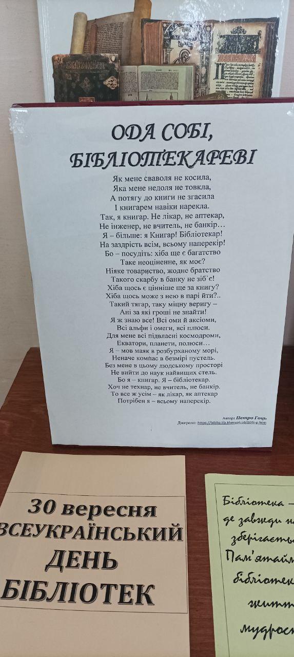 Традиційно, в останній день вересня, ми відзначаємо Всеукраїнський день бібліотек, а бібліотекарі - своє професійне свято. Бібліотека завжди була збирачем, хранителем і дослідником творів друку - вічних пам'яток духовної спадщини поколінь. У книгах міститься величезний досвід і знання. Книги розвивають мислення, уяву, вміння думати і міркувати. З цієї нагоди в читальному залі бібліотеки КЛК ХНУВС обладнана ілюстративно-книжкова виставка «Вітаємо з Днем бібліотек!», на якій представлені навчальні, довідкові, документальні, ілюстративні матеріали з даної тематики.