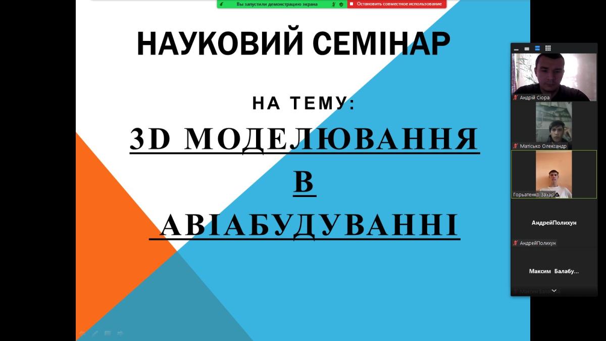 Викладачем циклової комісії природничих дисциплін Кременчуцького льотного коледжу ХНУВС Андрієм Сіорою було проведено науковий семінар для курсантів спеціальності 272 Авіаційний транспорт ОПП Аеронавігація на тему «3D моделювання в авіабудуванні». Семінар відбувся в онлайн режимі. Під час виступів курсантів із доповідями обговорено основні сучасні методи моделювання, та їх застосування при виготовленні деталей авіаційної техніки. Також розглянуто можливі перспективи розвитку даних напрямів промисловості в майбутньому. Доповіді проводилися з використанням презентацій. Курсанти брали активну участь в обговоренні виступів та вступали в дискусії з доповідачами.