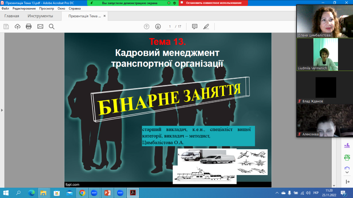 Старшою викладачкою циклової комісії економіки та управління, кандидаткою економічних наук Оленою Цимбалістовою за участі клінічного психолога, спеціаліста з питань психології управління та спеціаліста з питань психології кризових станів у надзвичайних ситуаціях Людмилою Верменич для здобувачів освіти зі спеціальності 073 «Менеджмент» освітньо-професійної програми «Організація обслуговування на транспорті» 23 листопада 2022 року проведено бінарне заняття навчальної дисципліни «Менеджмент на транспорті» за темою «Кадровий менеджмент транспортних організацій». Під час бінарного заняття здобувачі освіти ознайомились зі специфікою транспортного комплексу та його впливу на процеси управління персоналом. Особливими вимогами до умов роботи виробничого персоналу і управлінських кадрів, напрямками діяльності кадрових служб в транспортних організаціях. Людмила Верменич наголосила на ролі психологічного аспекту при відборі персоналу для роботи в транспортних організаціях. Акцентувала увагу здобувачів на типології особистості DISC, яку використовують для розуміння вимог та особистості людини. Наприкінці заняття відбулась дискусія між лекторами та здобувачами освіти.