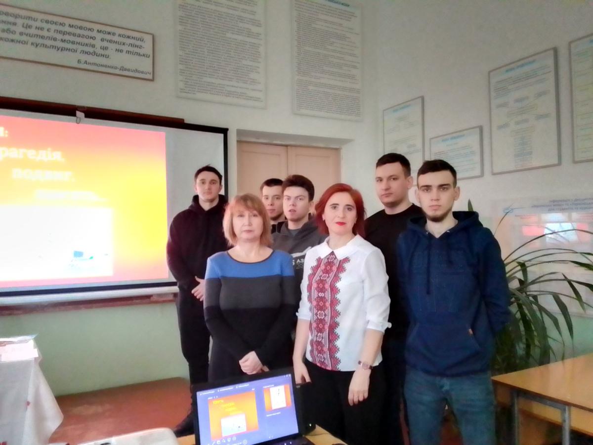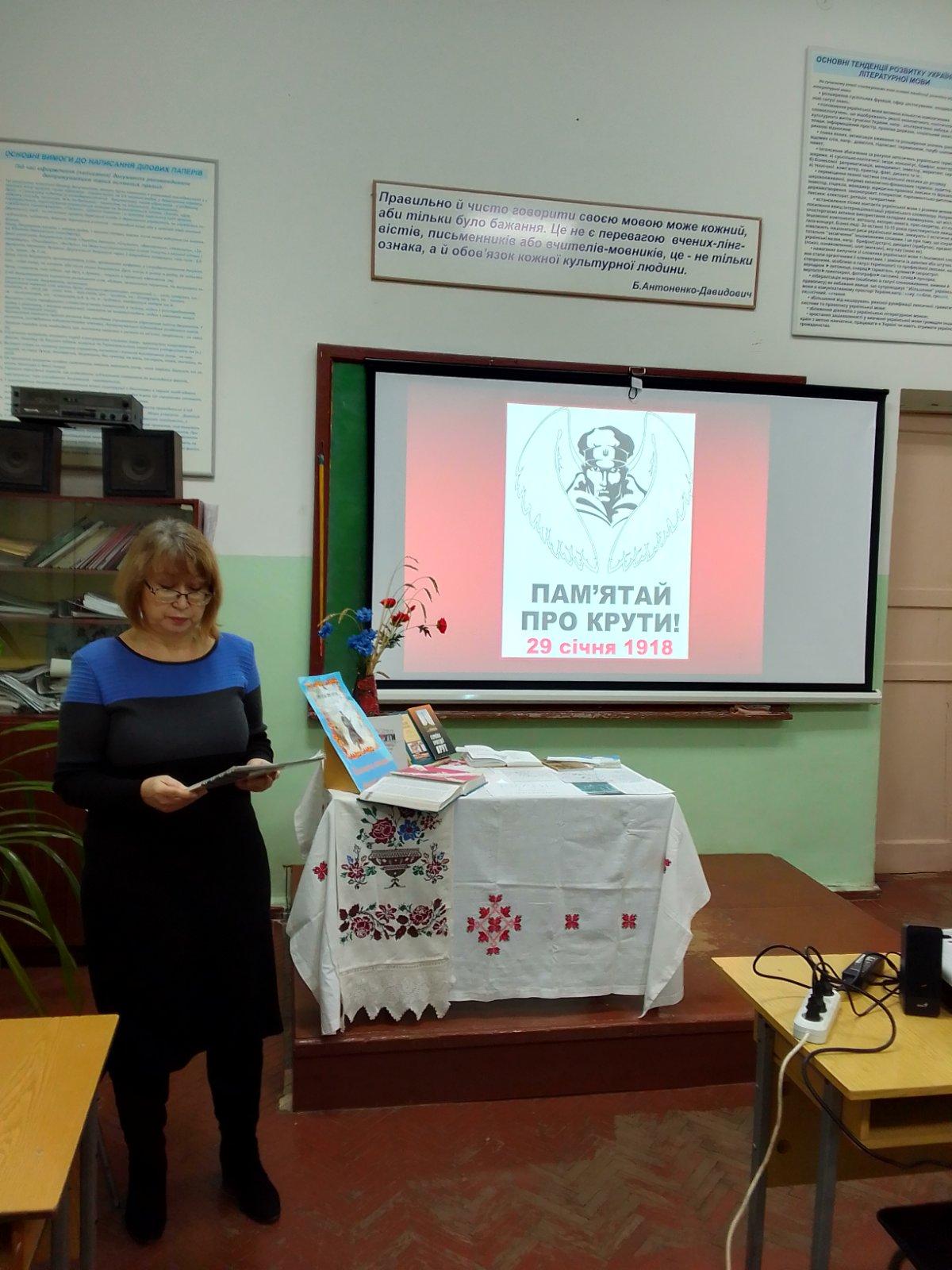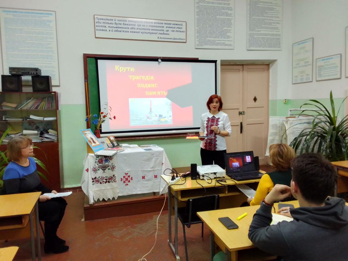 Здобувачам до уваги був продемонстрований екскурс в історичне минуле героїчної сторінки подій 29 січня 1918 року, що відбулися під Крутами. Викладачка Оксана Савченко познайомила слухачів із мовно-літературним аспектом зазначеної теми, декламуючи поезії українських поетів Павла Тичини «Пам’яті тридцяти» та Миколи Кульчицького, голови Полтавського осередку «Просвіти» «Вкраїнським героям!». Зокрема було закцентовано на мовних особливостях офіційно-ділового та наукового стилів, яким написані історичні розвідки про події 105-річної давнини. Запрошені гості підготували до уваги здобувачів історичний аспект теми, використавши безліч історичних документів, відео та світлин про крутянські події. Слухачі після перегляду презентації провели паралель між подіями 29 січня 1918 року та сьогодення. Кожен з них з глибокою повагою та шаною відчув поклик душі учасників подій під Крутами.