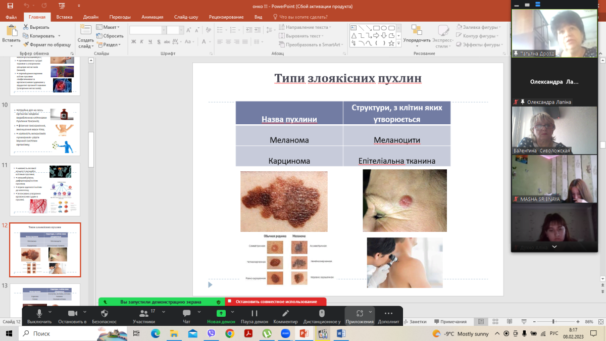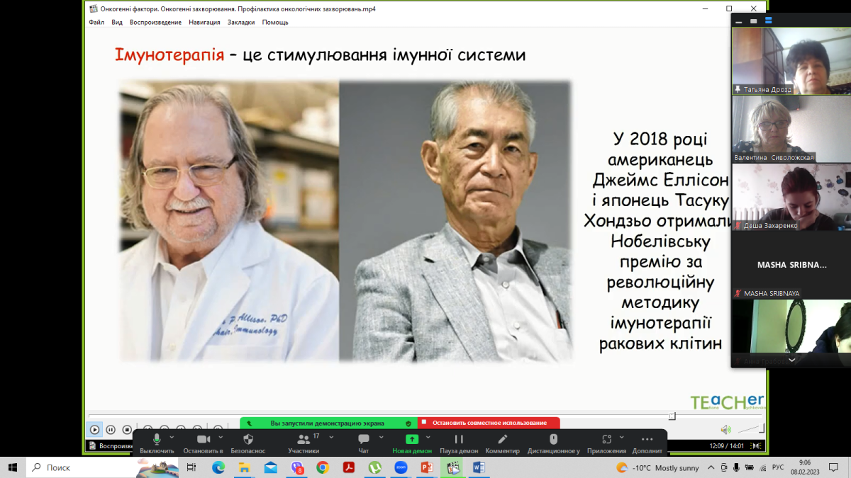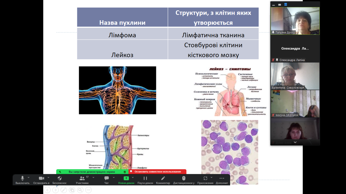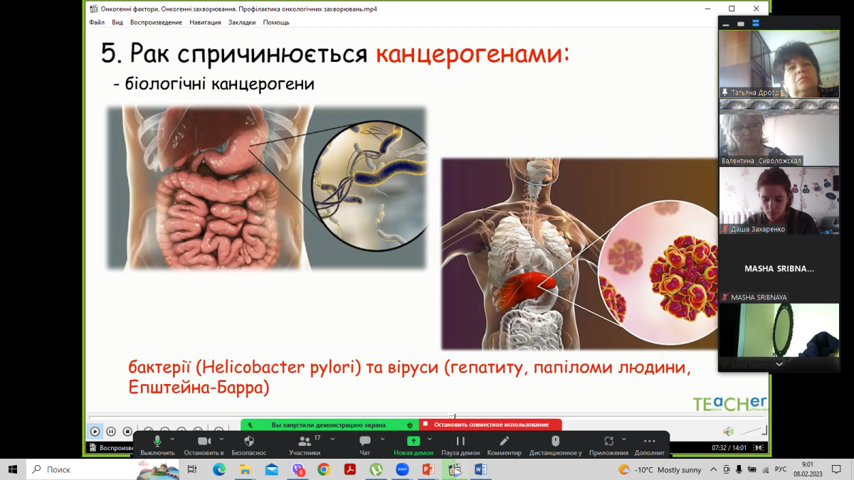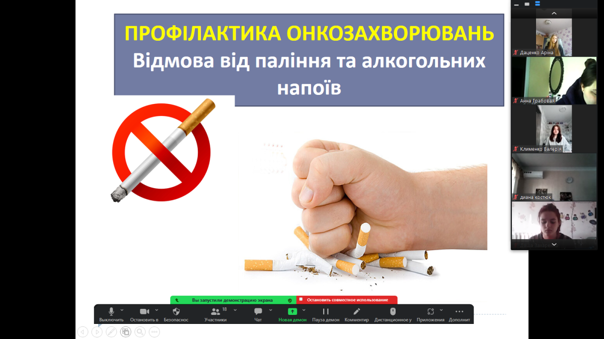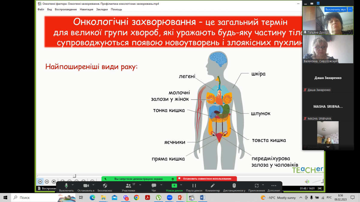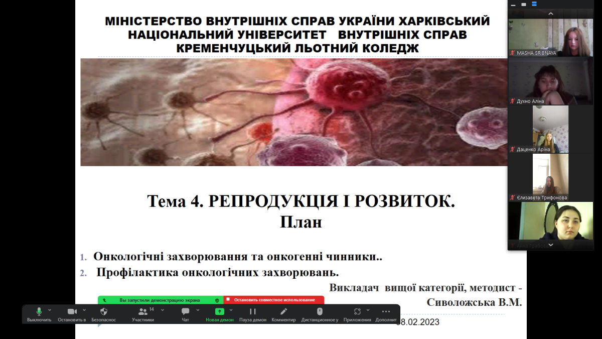 08 лютого 2023 року викладачем циклової комісії технічного обслуговування авіаційної техніки, спеціалістом вищої категорії, викладачем-методистом Валентиною Сиволожською для студентів 1 курсу (групи ООТдбср-22-1) було проведено бінарне заняття з навчальної дисципліни "Біологія і екологія" на тему: "Онкологічні захворювання та онкогенні чинники. Профілактика онкологічних захворювань".