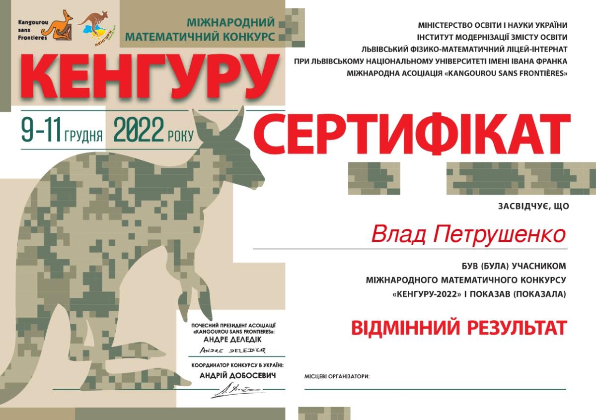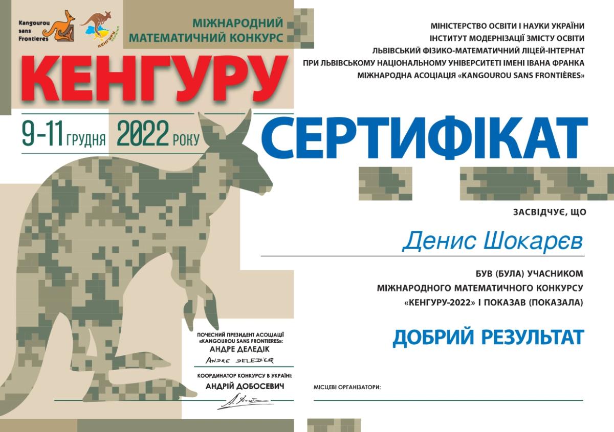 За підсумками проведеного Міжнародного математичного конкурсу «Кенгуру 2022» отримані наступні результати: «відмінно» - 2 осіб, «добре» - 16 осіб, сертифікат за участь - 14 осіб, не отримали сертифікати – 25 осіб.