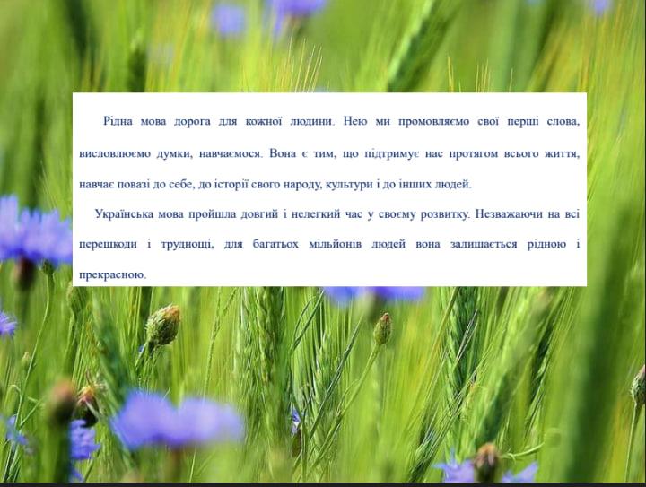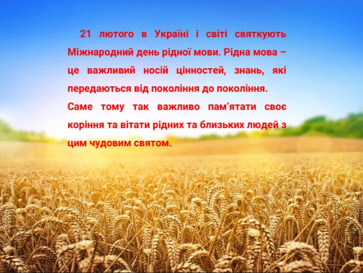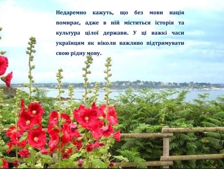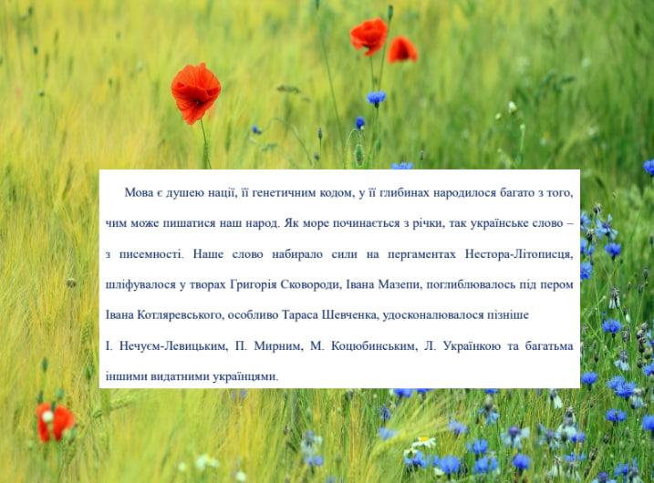 Українською мовою розмовляли наші діди та прадіди, а матері та бабусі співали колискові! Народ наш сміявся і плакав рідною мовою. Шануйте і любіть рідну мову, піклуйтеся про неї, захищайте, розкривайте для себе її велич й могутню силу. Збережіть її в усій чудовій красі для себе й наступних поколінь!