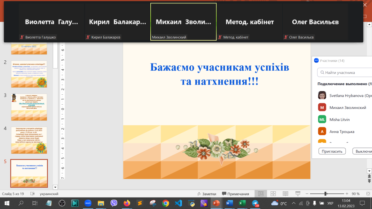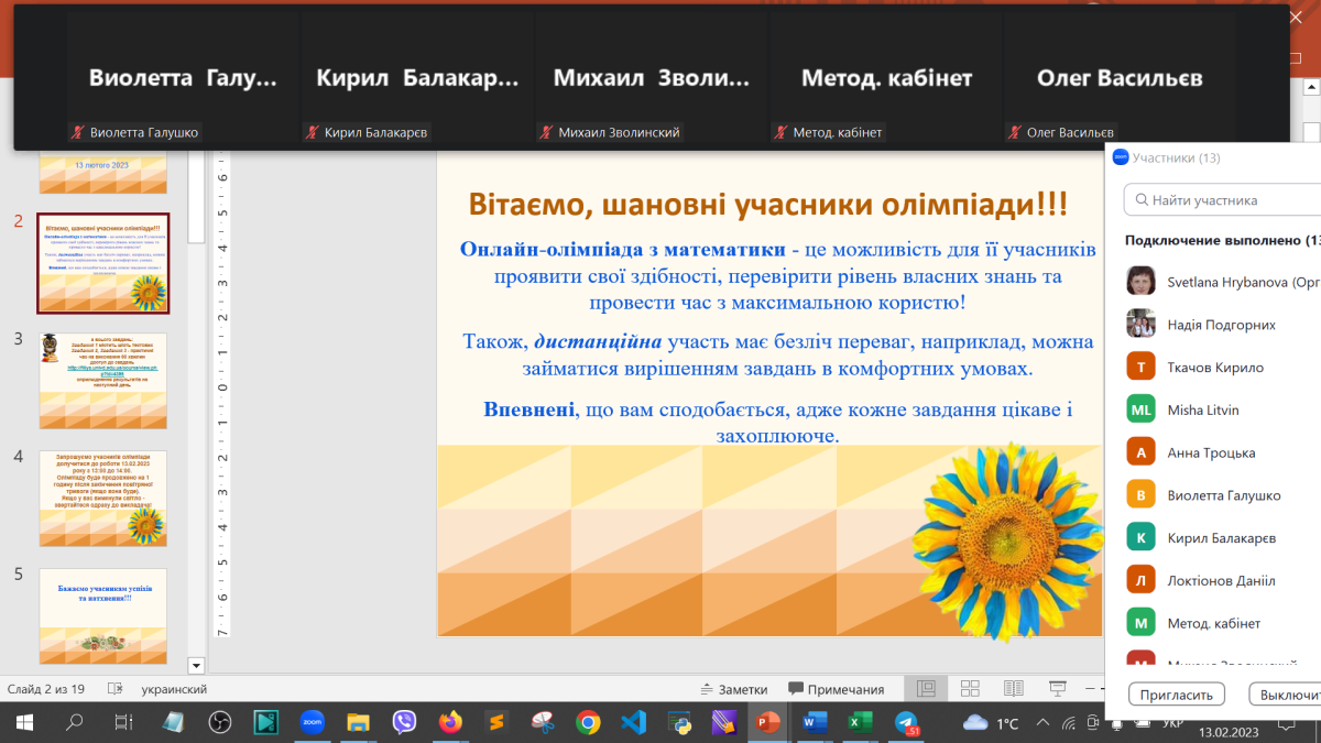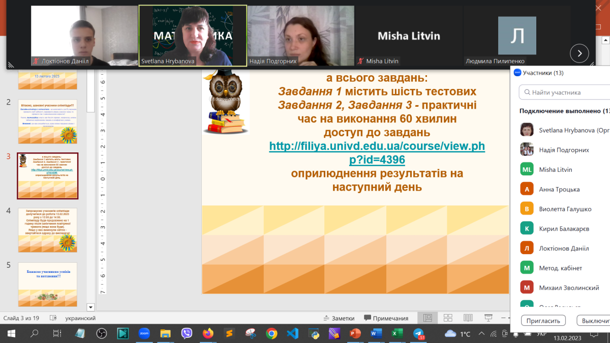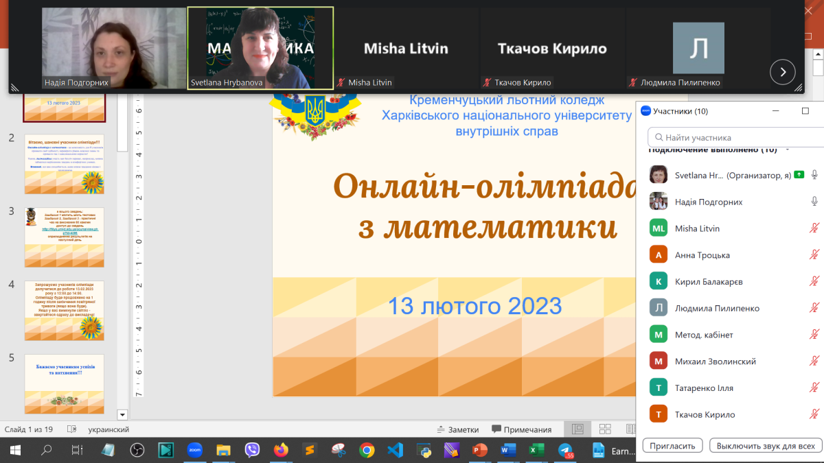 13 лютого 2023 року викладачками циклової комісії «Природничих дисциплін» Оксаною Гусаровою, Світланою Грибановою, Надією Подгорних та Людмилою Пилипенко організовано і проведено олімпіаду з математики.