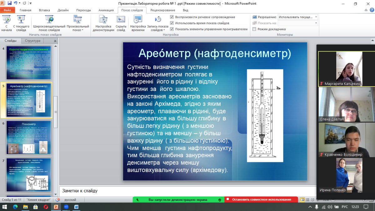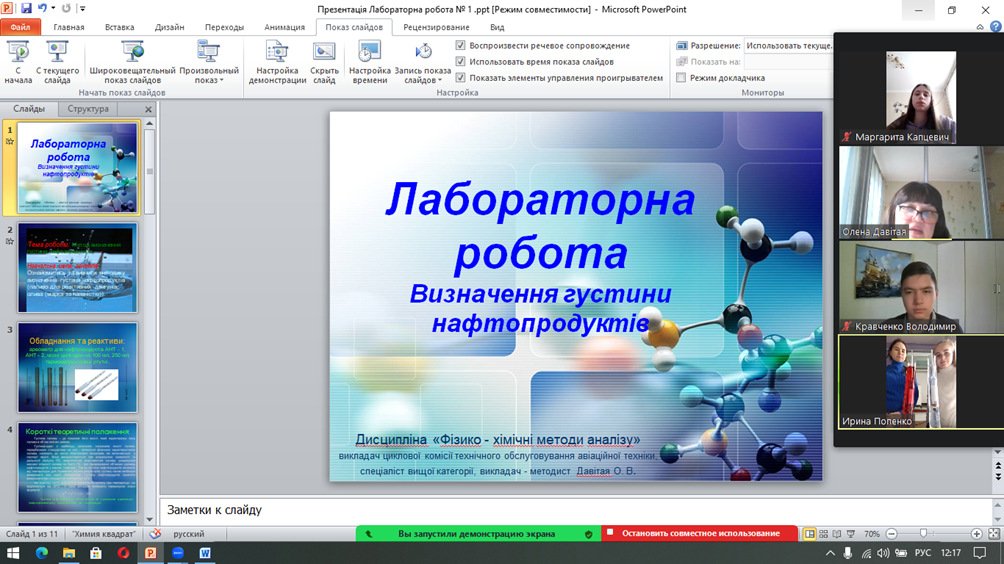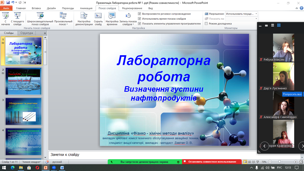 17 лютого 2023 року викладачем-методистом циклової комісії технічного обслуговування авіаційної техніки, спеціалістом вищої категорії Давітая Оленою Вікторівною було проведено бінарне заняття з навчальної дисципліни «Фізико-хімічні методи аналізу» за темою «Визначення густини нафтопродуктів», у форматі Zoom-конференції для здобувачів 3 курсу (група ТПМдбср-20-1).