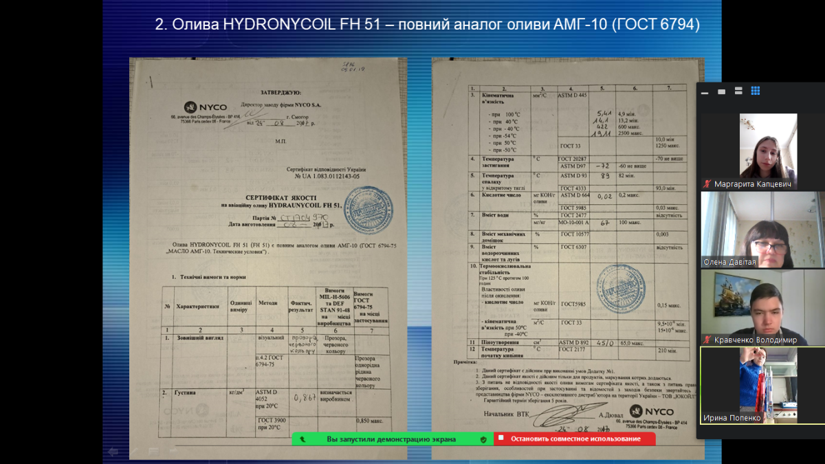 Бінарне заняття проводилось (лабораторна робота) за участю представників служби ПММ аеродрому Велика Кохнівка – Сич Тетяни Віталіївни та Попенко Ірини Віталіївни, які розповіли про використання на практиці різноманітних методів фізико-хімічного аналізу. Здобувачі отримали відповіді на запитання стосовно організації та проведення контролю якості пального під час його приймання та заправлення повітряних суден.