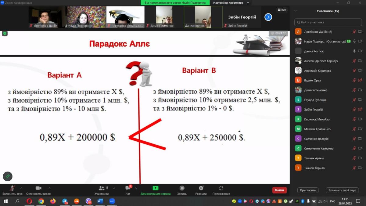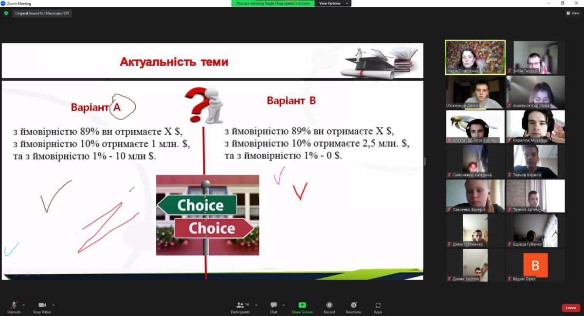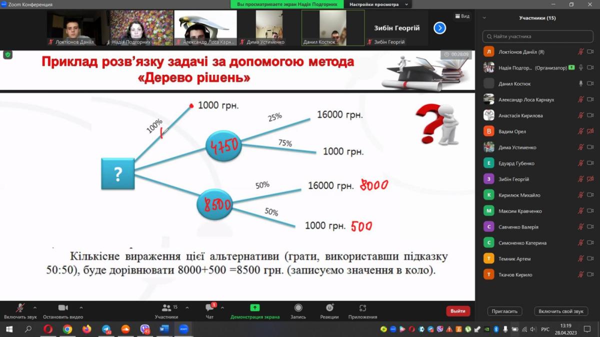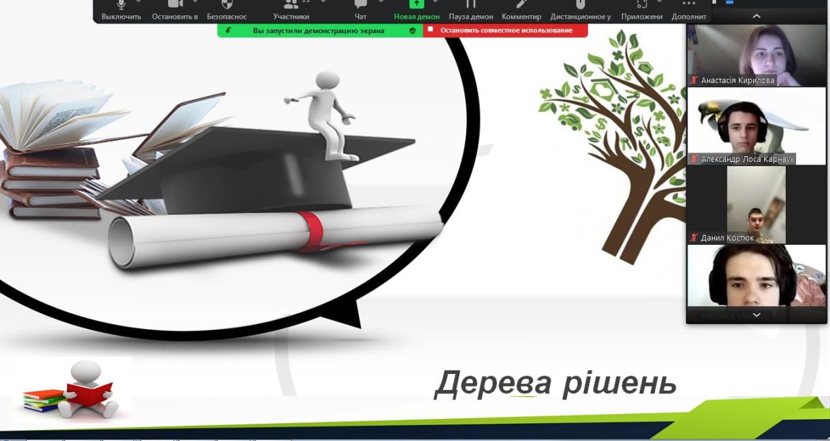 Учасниками були підготовлені змістовні доповіді, за наступними питаннями: актуальність теми, дерево рішень, парадокс Аллє, приклад розв’язку задачі за допомогою метода «дерево рішень», переваги та сфери використання методу .
