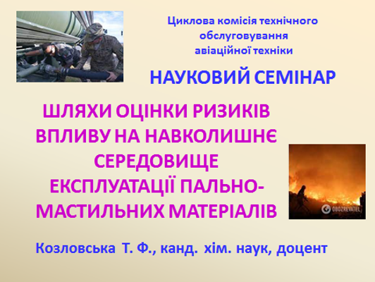На науковому семінарі були висвітлені питання стосовно видів пально-мастильних матеріалів, шляхів їх одержання, призначення ПММ. Окремо було доведено, чим відрізняється пальне від мастил. Здобувачі ознайомились з можливостями застосування різних типів біопалив для авіаційної промисловості, з основними поняттями теорії ризиків, математичними підходами із застосуванням методів статистки і теорії ймовірності, видами програмного забезпечення задля прогнозної оцінки шкідливого впливу небезпечних органічних складових ПММ на компоненти навколишнього природного середовища на формування захворювань людини зокрема. Приділена увага взаємозв’язку експлуатації ПММ і впливу на якість природних вод і питної води, атмосферного повітря, виснаження ґрунтів, екологічні властивості рослин – деревних і чагарникових насаджень навколо місць зберігання, перекачування, заправлення ПММ.