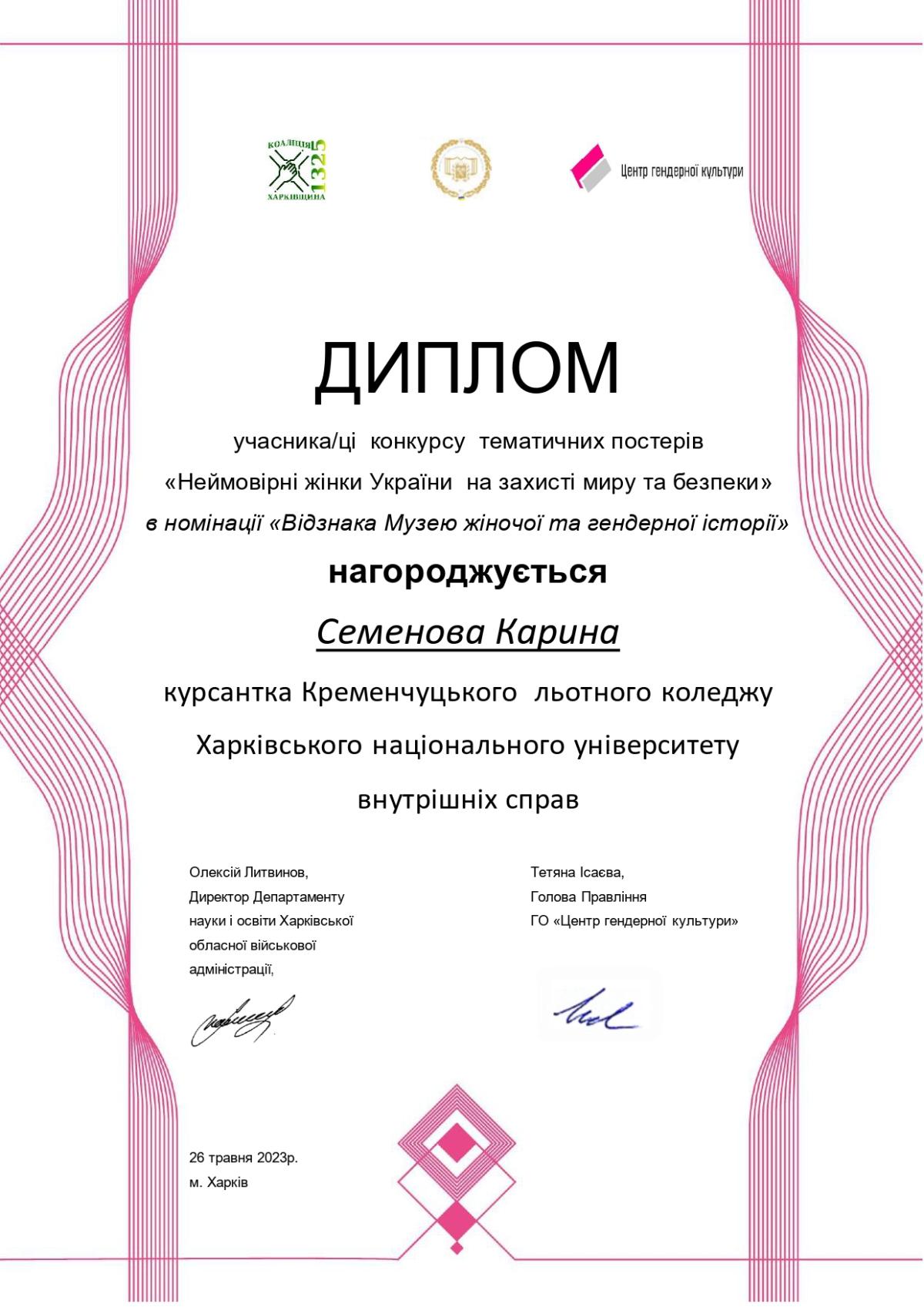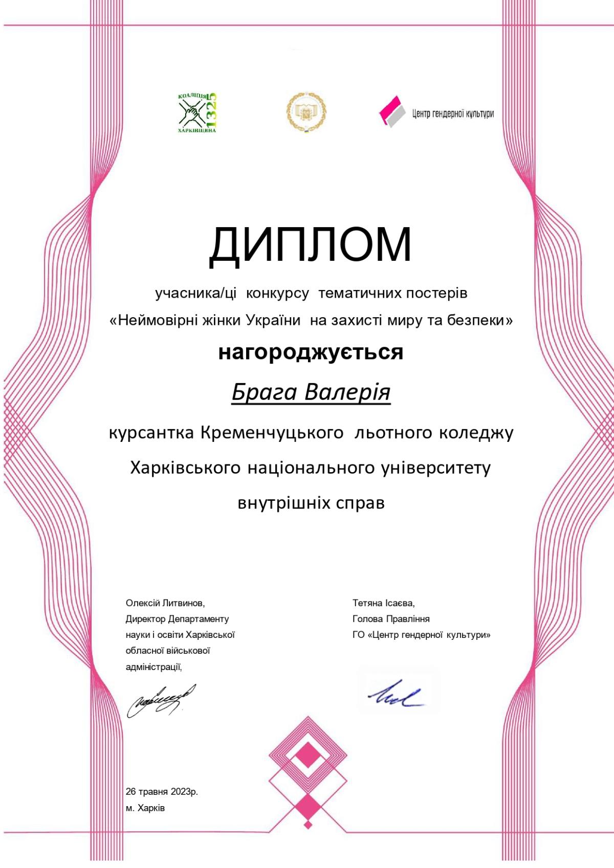 Представники/ представниці Кременчуцького льотного коледжу Харківського національного університету внутрішніх справ на запрошення Коаліції «Харківщина 1325» та Харківської обласної військової адміністрації взяли участь у конкурсі постерів «Неймовірні жінки України на захисті миру та безпеки», що проходив з нагоди відзначення Міжнародного дня музеїв Коаліція «Харківщина _1325» за ініціативи Музею жіночої та ґендерної історії «Ніч у музеї».