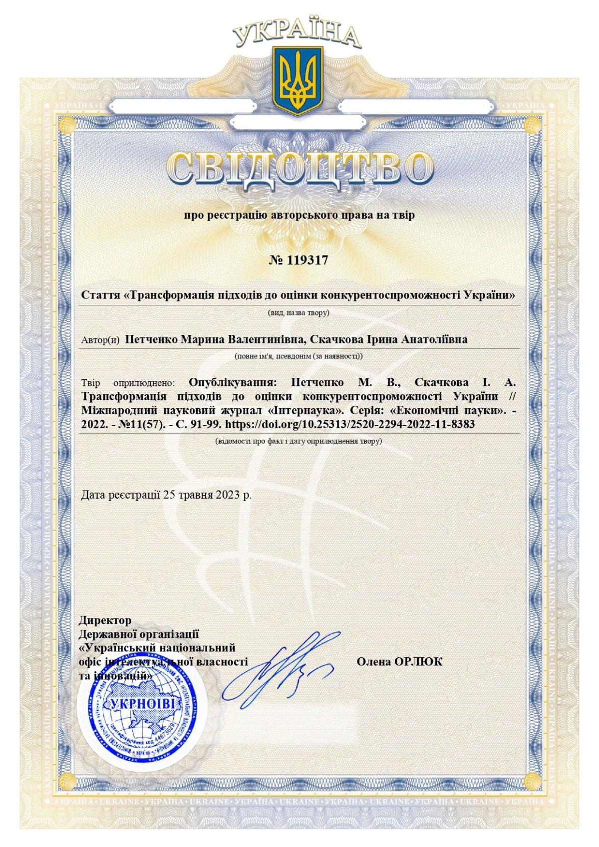 Представниці Кременчуцького льотного коледжу Харківського національного університету внутрішніх справ - відповідальна з академічної доброчесності, кандидатка економічних наук, доцентка Марина Петченко та кандидатка технічних наук, доцентка, науковий співробітник відділу організації наукової роботи та гендерних питань Ірина Скачкова отримали свідоцтво про реєстрацію авторського права на твір, а саме статтю «Трансформація підходів до оцінки конкурентоспроможності України».