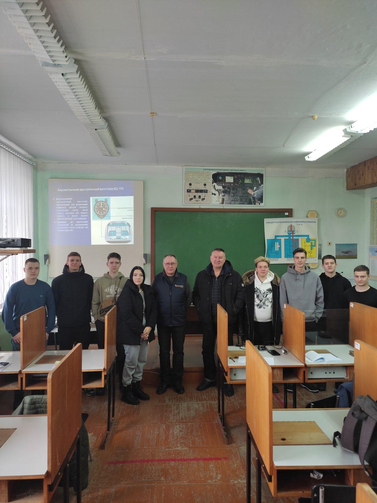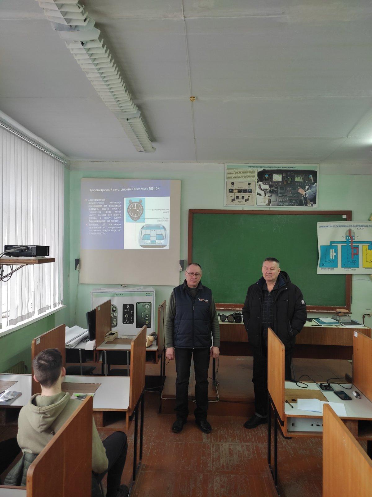 Під час бінарного заняття Юрій Стущанський ознайомив здобувачів освіти з видами мембрано – анероїд них приладів, які використовуються для формування пілотажної інформації для пілота повітряного судна, а також пояснив принципи їх дії. Олег Калінін розповів про порядок перевірки перед польотом та особливості користуванням в польоті барометричним висотоміром, покажчиком швидкості. Також навів приклади характерних відмов цих приладів на вертольоті. Наприкінці заняття доповідачі відповіли на запитання здобувачів вищої освіти стосовно особливостей експлуатації мембрано – анероїдів приладів, їх точності та причин похибок.