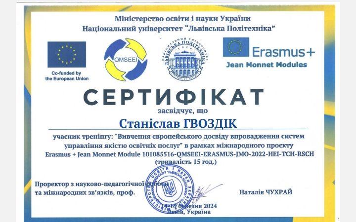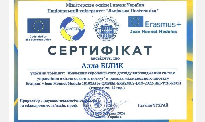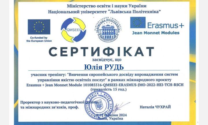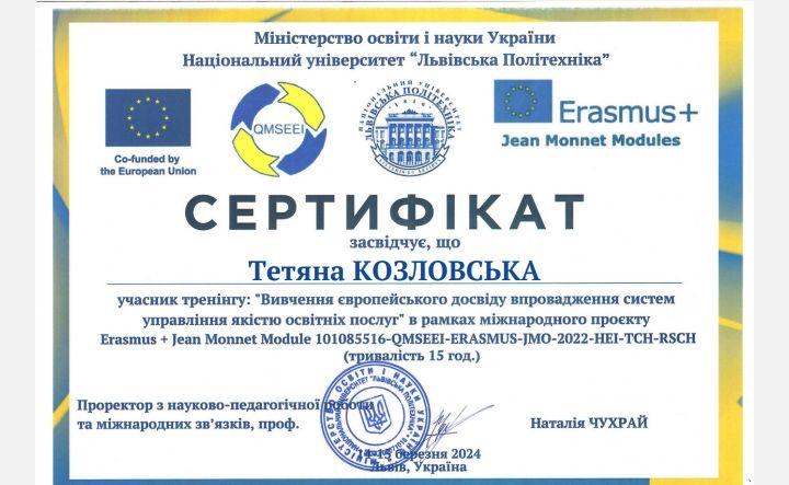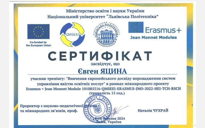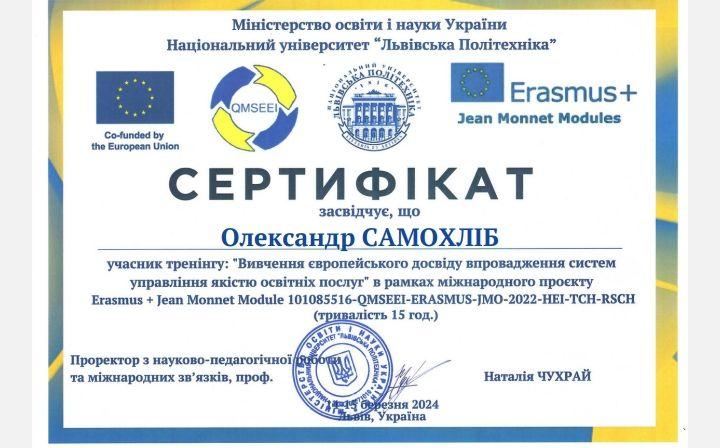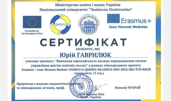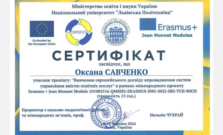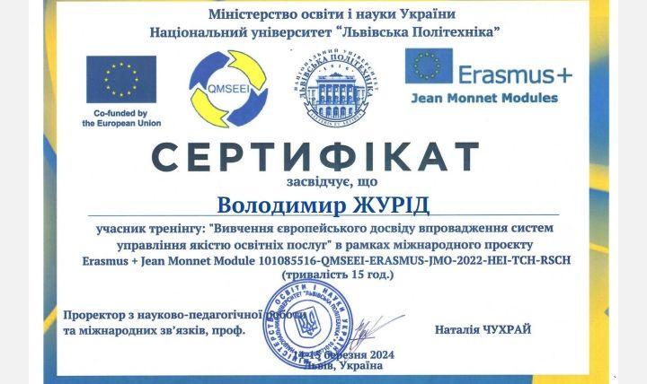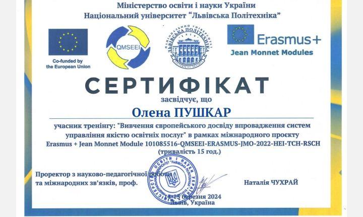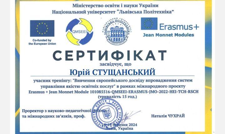 Задля сприяння формуванню молодої науково-технічної еліти України в Національному університеті «Львівська політехніка» 14-15 березня 2024 року відбувся тренінг для вивчення європейського досвіду і визначення основних тенденцій в системах управління якістю щодо розробки, впровадження і сертифікації систем управління якістю освітніх послуг відповідно до вимог стандартів EN ISO 9001, ESG 2015. Кафедра інформаційно-вимірювальних технологій, автоматики та метрології Львівської політехніки організувала проведення заходу, в якому брали участь представники закладів вищої освіти України. Це вже був другий тренінг, проведений за міжнародним проєктом Програми Erasmus + напряму Jean Monnet «Європейський досвід впровадження систем управління якістю продукції та послуг», до якого долучилися керівники та члени проєктних груп, науково-педагогічні та педагогічні працівники навчального відділу Кременчуцького льотного коледжу Харківського університету внутрішніх справ, а саме: Алла Білик, Євген Волканін, Юрій Гаврилюк, Станіслав Гвоздік, Володимир Журід, Тетяна Козловська, Катерина Миколенко, Олена Пушкар, Алла Реута, Юлія Рудь, Оксана Савченко, Олександр Самохліб, Юрій Стущанський, Євген Яцина. Робота тренінгу проходила в очному форматі в аудиторіях Львівської політехніки та у форматі онлайн із використанням Microsoft Teams. До заходу були залучені досвідчені фахівці Університету й низки підприємств та установ, зокрема Global Logic, Leoni Wiring Systems, Державного підприємства «НДІ «Система». Підсумовуючи результати тренінгу, учасники заходу пройшли тест та отримали іменні сертифікати.