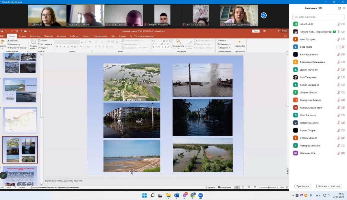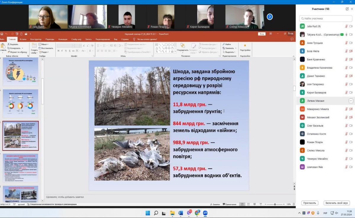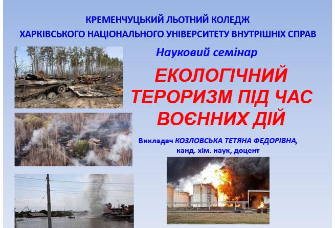 27 березня 2024 року на цикловій комісії технічного обслуговування авіаційної техніки викладачем, канд. хім. наук, доцентом Тетяною Козловською був проведений науковий семінар «Екологічний тероризм під час воєнних дій» для здобувачів вищої освіти ІІ курсу спеціальності 173 «Авіоніка» за освітньо-професійною програмою 173 «Експлуатація авіаційних електрифікованих комплексів» освітньо-професійного ступеня «фаховий молодший бакалавр» (група ТЕдбср-22-1).
