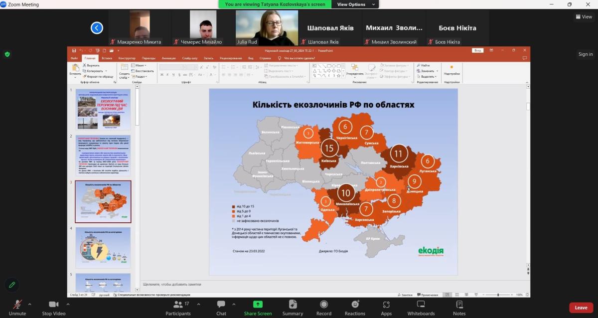 Тетяна Козловська розповіла про екологічний тероризм не з класичної точки зору визначення екологічного тероризму, а з урахуванням небезпечних воєнних чинників і їх впливу на всі компоненти навколишнього природного середовища, техногенні об’єкти і життя людей.