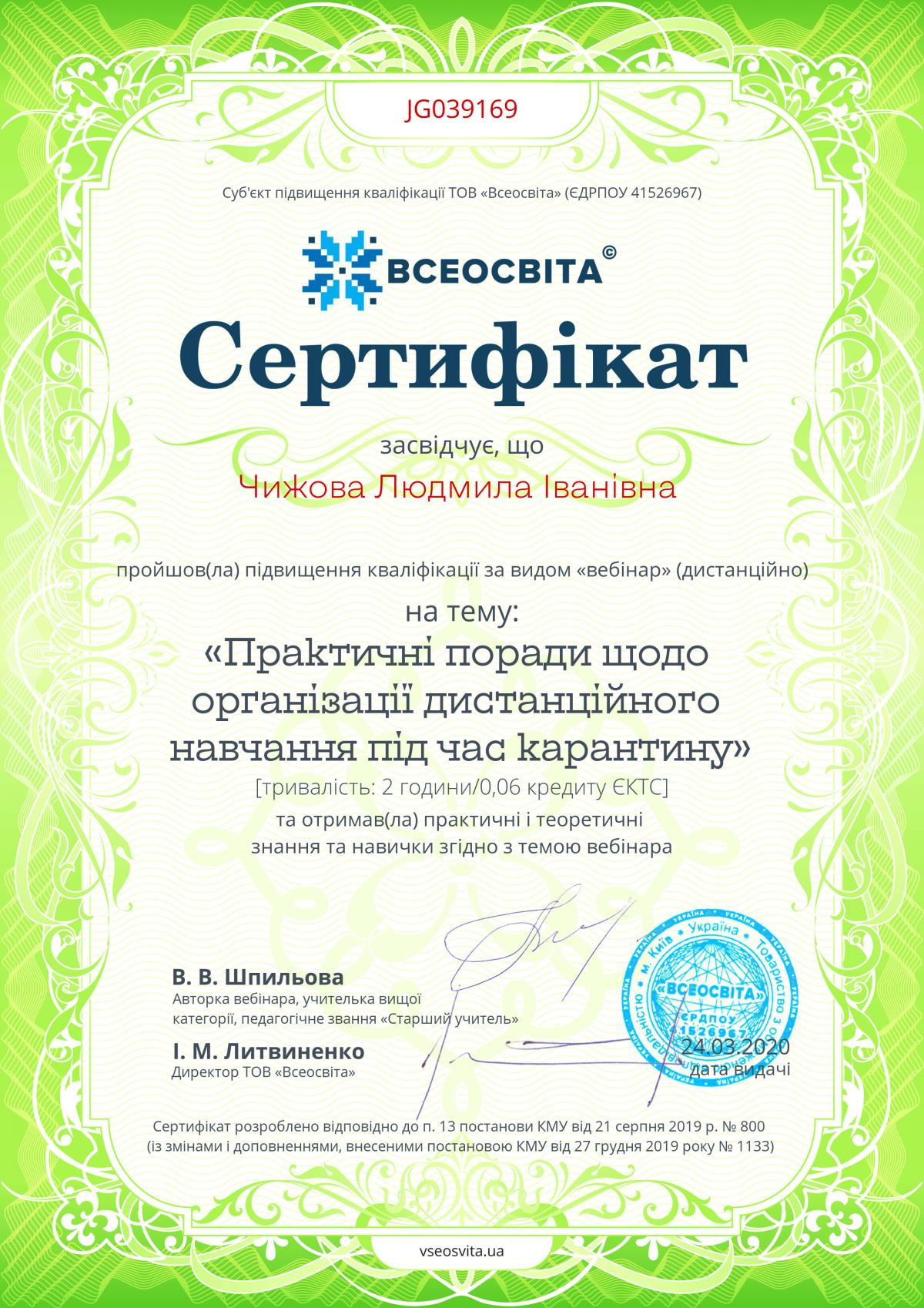 Викладач циклової комісії української та іноземної мов Кременчуцького льотного коледжу Людмила Чижова взяла участь у ряді вебінарів освітнього проекту «Всеосвіта». Серед них: «Практичні поради щодо організації дистанційного навчання під час карантину» та «Використання онлайн-тестів для організаціїї дистанційного навчання в умовах карантину». Набутті знання викладач впроваджує у практичну діяльність в процесі викладання дисциплін онлайн.